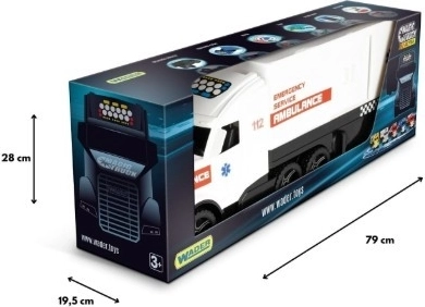 Duży dziecięcy samochód ciężarowy MAGICKY TRUCK ACTION Ambulans ze zdejmowanym kontenerem, przesuwnymi drzwiami i podporami. Wytrzymały, bezpieczny, długość do 81 cm.
