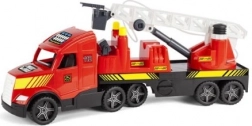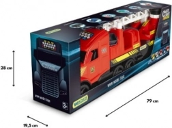 Duży wóz strażacki z serii Magic Truck Action ucieszy każdego małego bohatera. Oferuje wysuwaną i ruchomą drabinę z koszem, działającą pompkę oraz wąż ze zbiornikiem na wodę, obrotowe elementy do kierowania strumieniem oraz solidną, wytrzymałą konstrukcję z bezpiecznych materiałów. Naczepa jest skrętna i odłączana, można ją podłączyć na dwa sposoby, do długości ok. 80 cm.