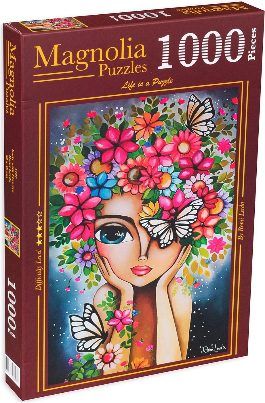 Odkryj piękno szczegółowego motywu dziewczyny z kwiatami na wysokiej jakości puzzlach składających się z 1000 elementów. Precyzyjnie wycięte elementy doskonale do siebie pasują, zapewniając przyjemne i kojące doświadczenie układania. Po ukończeniu powstaje obraz o wymiarach 48 × 68 cm, który świetnie nadaje się do oprawienia.