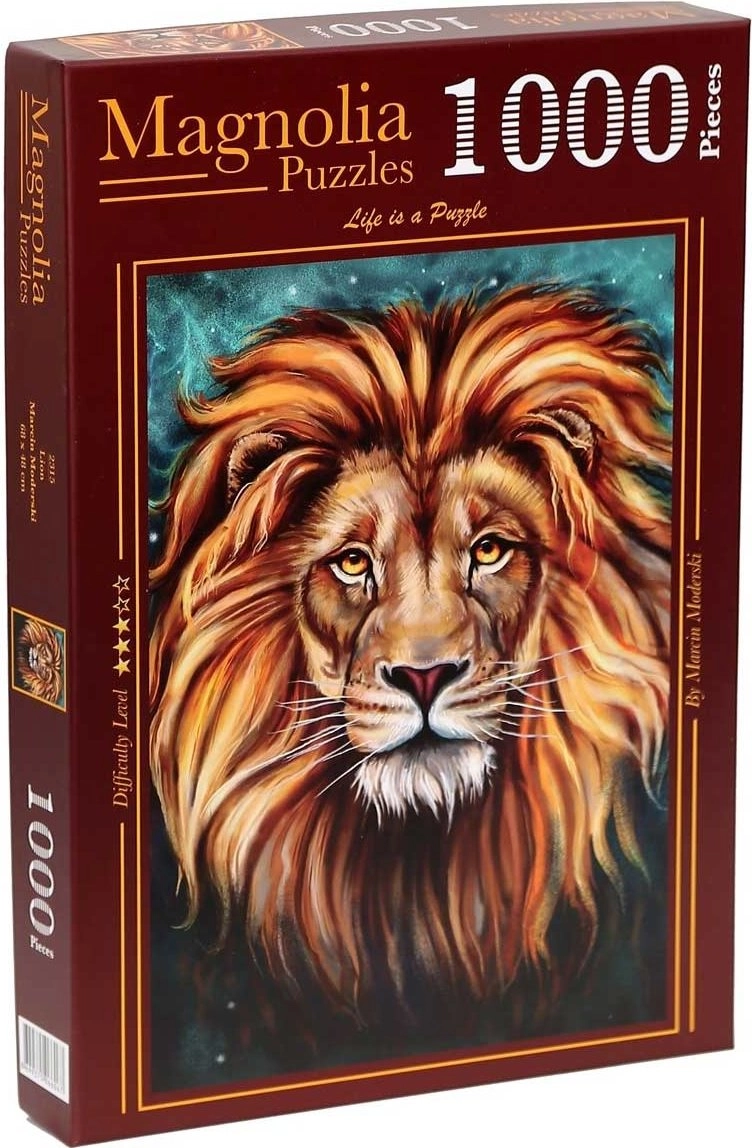 Ciesz się relaksem i zabawą z wysokiej jakości puzzlami z motywem majestatycznego lwa. Układanka z 1000 elementów stanowi przyjemne wyzwanie, a po ułożeniu tworzy obraz o wymiarach 48 × 68 cm, idealny do oprawienia w ramę.