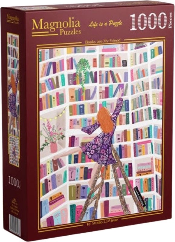 Odkryj urok spokojnych chwil z puzzlami Magnolia „Książki są moimi przyjaciółmi”. Zestaw 1000 elementów prezentuje estetyczny motyw biblioteki i przyjemny poziom trudności idealny na odpoczynek po wymagającym dniu.