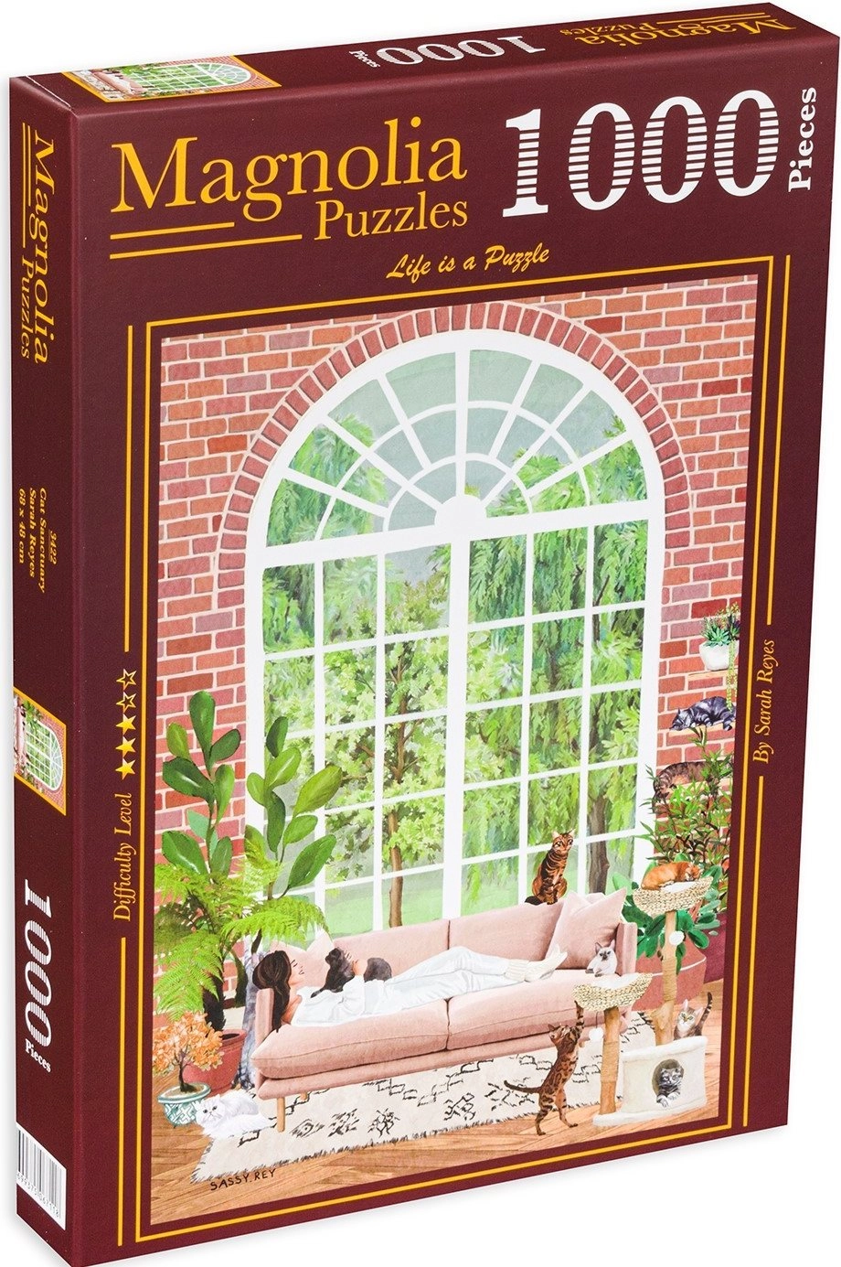 Rozkoszuj się chwilami relaksu z eleganckimi puzzlami „Kocie schronienie”. Tysiąc starannie wyciętych elementów tworzy efektowny obraz idealny do oprawienia. Dzięki wymiarom ok. 48 × 68 cm gotowe dzieło pięknie prezentuje się na ścianie lub półce.