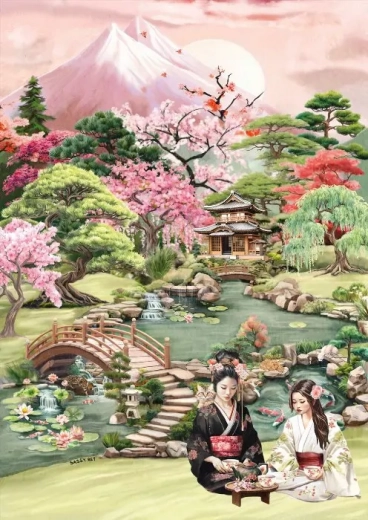 - Detaliczny motyw herbaciarnianego ogrodu z przyjemną kolorystyką.