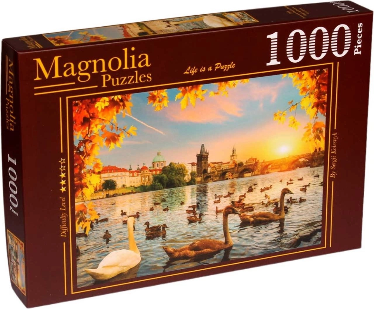 Zrelaksuj się przy układaniu wysokiej jakości puzzli z motywem łabędzi i MOSTU KAROLA. Opakowanie zawiera 1000 elementów, a po ułożeniu powstanie obraz o wymiarach 68 × 48 cm – idealny do oprawienia w ramę.