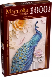 Elegancki motyw niebieskiego pawia zachwyci miłośników natury i zapalonych układaczy. Dzięki 1000 elementom puzzle stanowią przyjemne wyzwanie, a zarazem świetny sposób na relaks. Gotowy obrazek ma uniwersalny wymiar 48 × 68 cm, który łatwo oprawić, a na ścianie prezentuje się znakomicie.