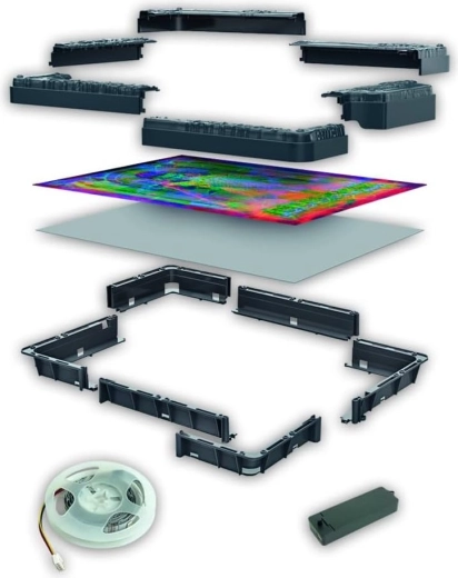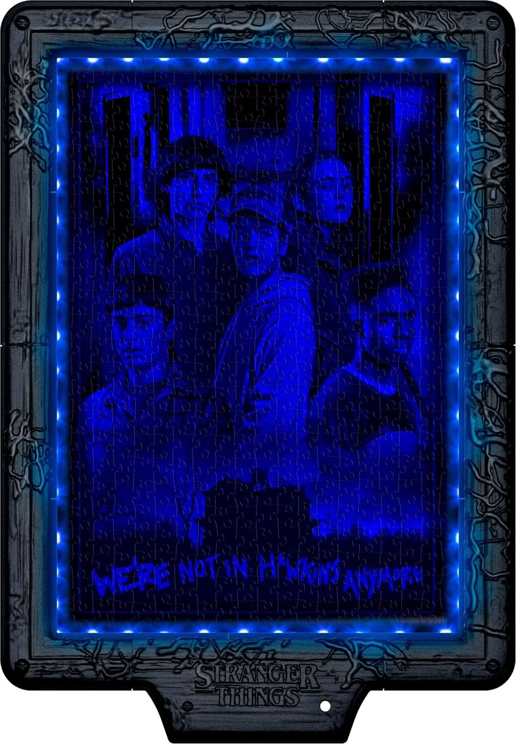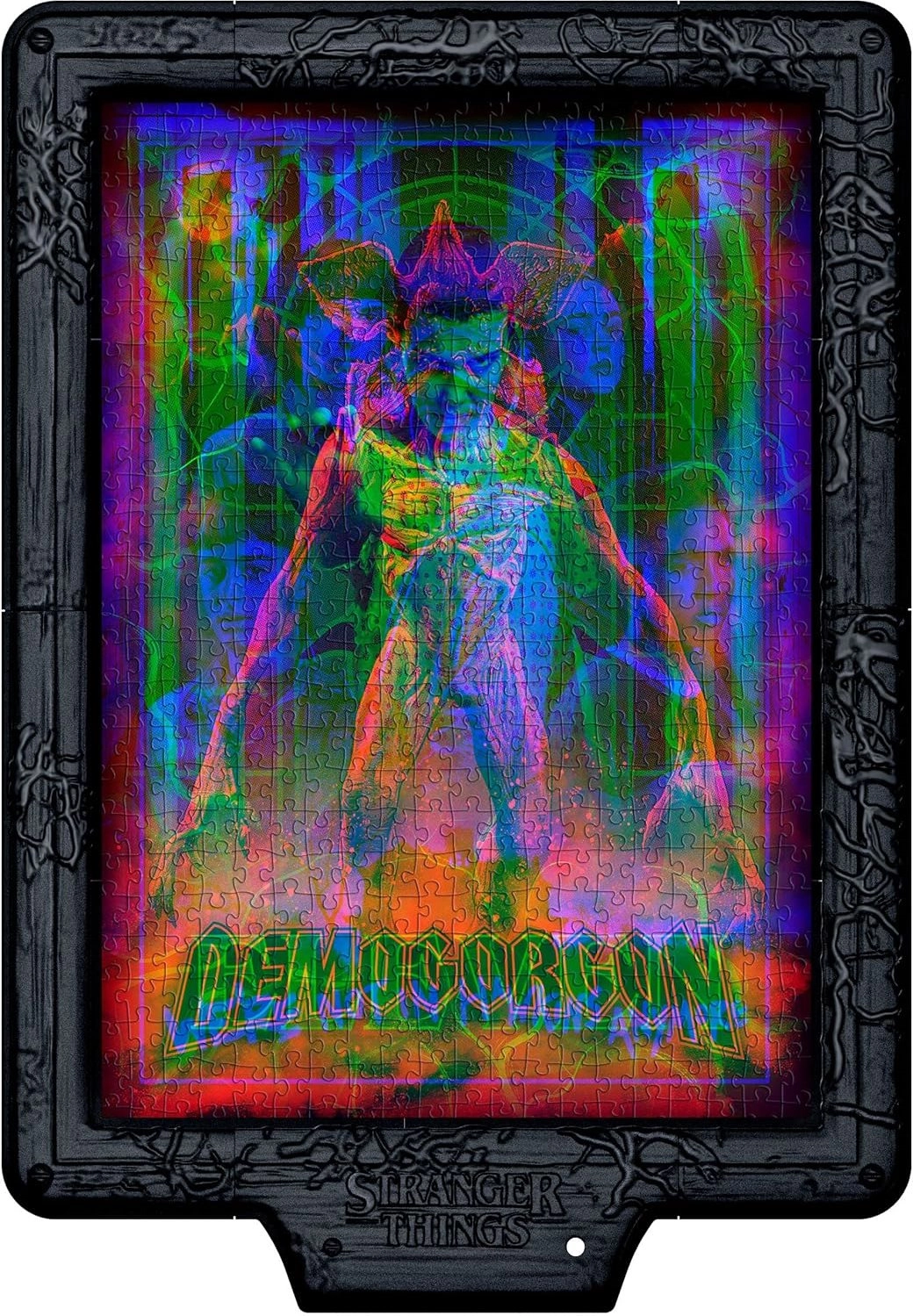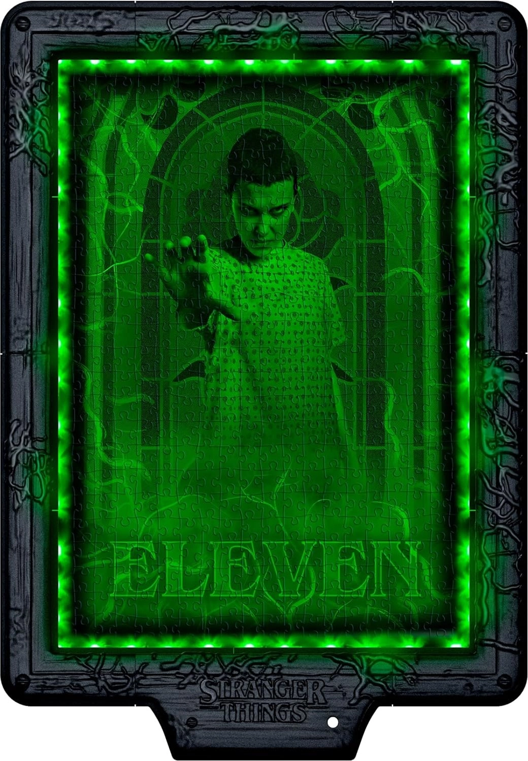Te wyjątkowe puzzle przeniosą filmową atmosferę serialu STRANGER THINGS do Twojego domu. Dzięki zintegrowanemu modułowi elektronicznemu i taśmie RGB LED obraz po włączeniu światła ulega przemianie – każdy kolor LED odkrywa inną warstwę sceny z polowaniem na Demogorgona. W zwykłym oświetleniu zobaczysz kompozycję z nałożeniem trzech kolorystycznych poziomów, w ciemności zaś każdy odcień wydobędzie nowy detal.