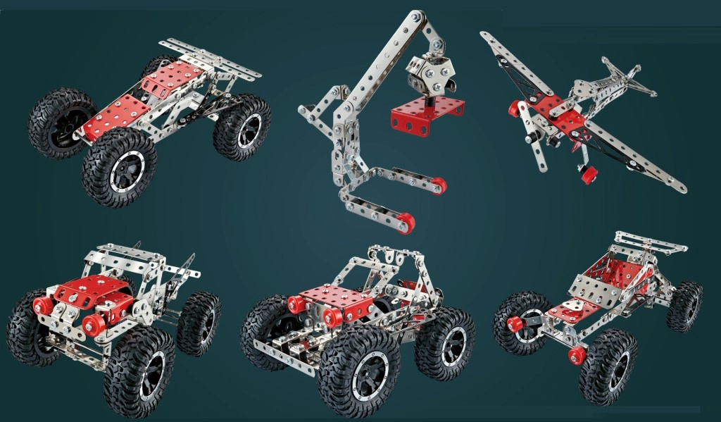 Zbuduj własny model samochodu terenowego z solidnego zestawu zawierającego 288 elementów. Połączenie metalowych części i plastikowych dodatków skręcanych śrubkami i nakrętkami sprawia, że budowa jest stabilna, zabawkowa i jednocześnie stanowi wyzwanie dla zręcznych rąk oraz cierpliwości. Idealna do rozwoju małej motoryki, logicznego myślenia i kreatywności.
