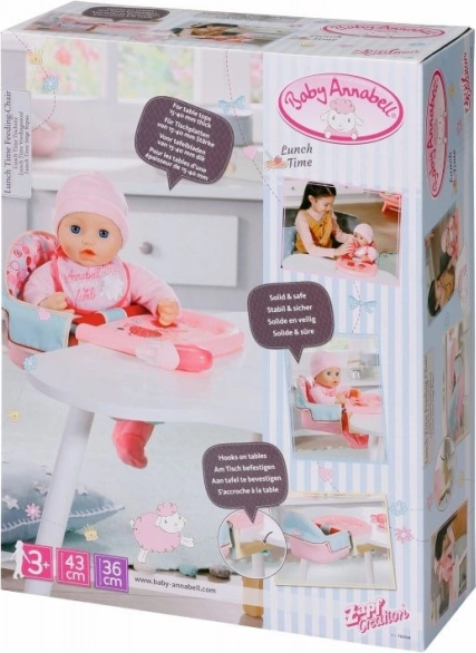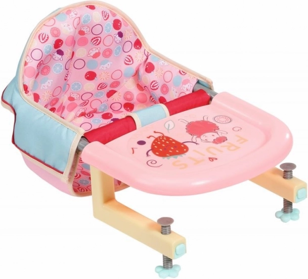 Podaruj lalce Baby Annabell wygodne miejsce przy stole. Kolorowe krzesełko z uroczymi motywami owoców i jedzenia mocno przytwierdza się do stołu za pomocą śrubowych zacisków, dzięki czemu podczas zabawy i karmienia jest stabilne i bezpieczne. Miękkie wyściełanie zapewnia komfort, a odłączany stolik sprawdzi się do zabawy, rysowania i tworzenia.