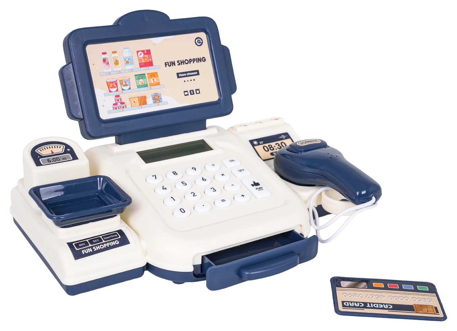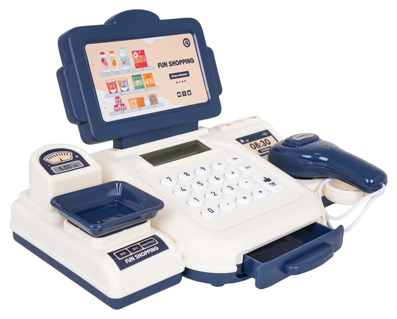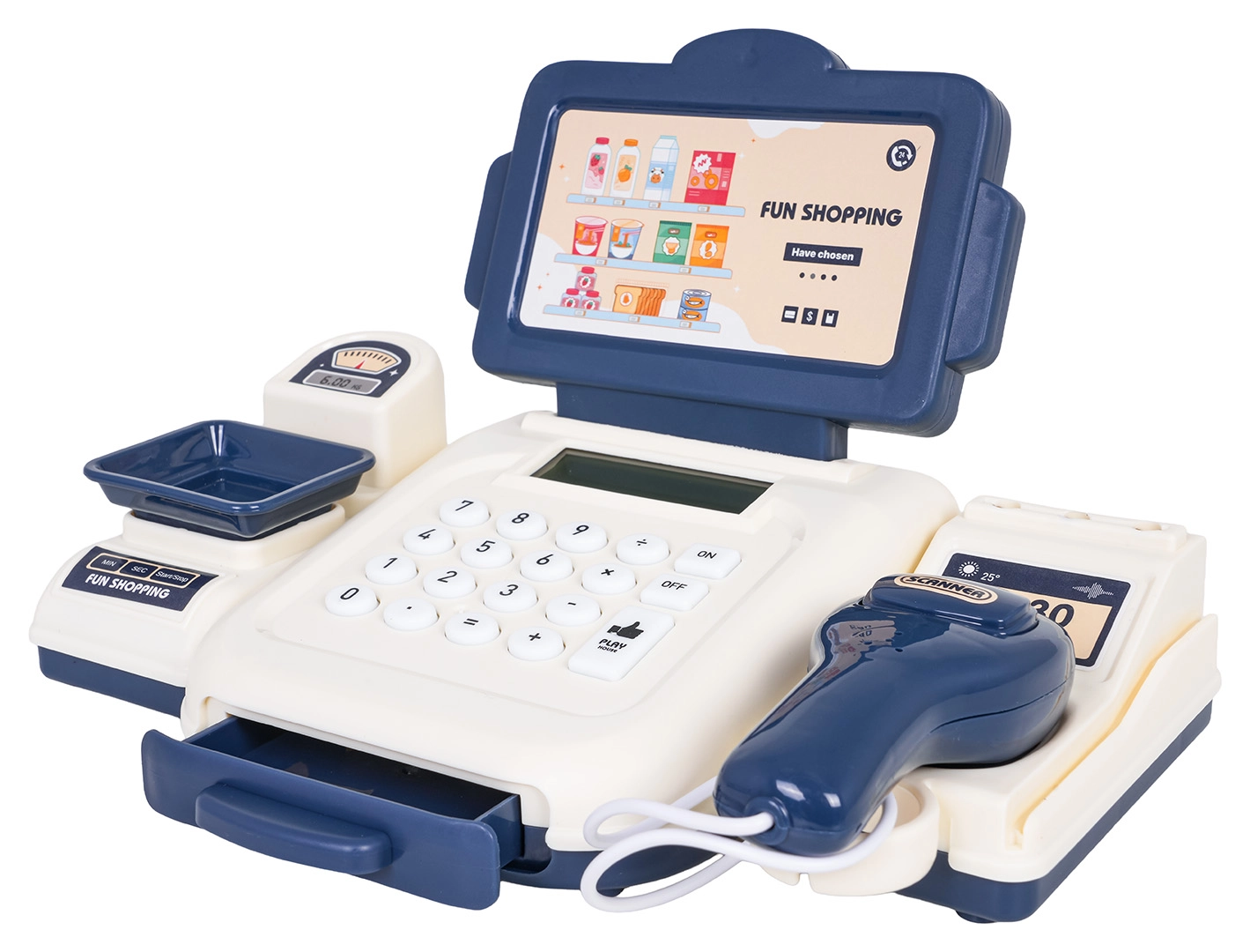 Połóż towar na wadze, oblicz kwotę i bezpiecznie schowaj banknoty do wysuwanej szuflady – zabawa w sklep jak w rzeczywistości.