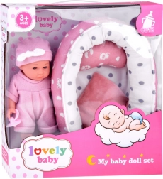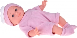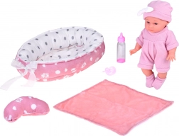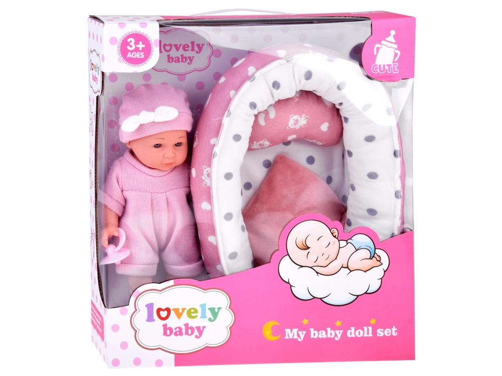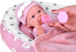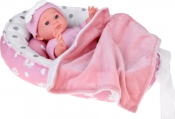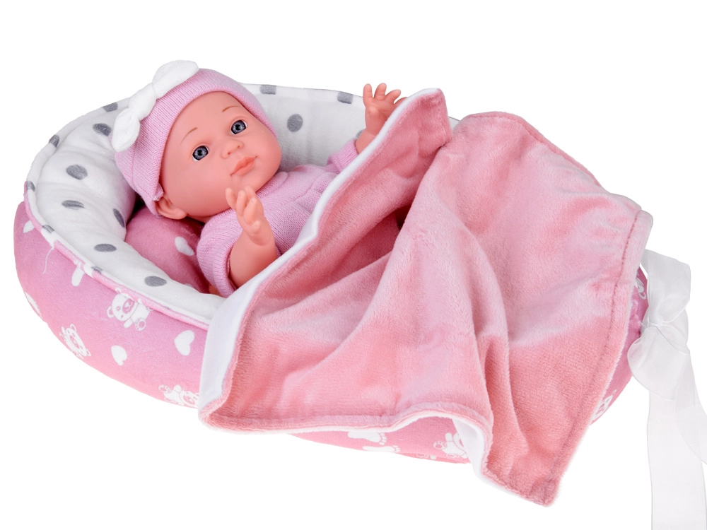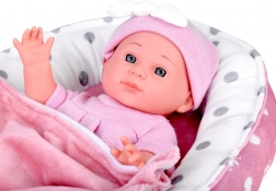 Urocze niemowlę w różowym ubranku z miękkim gniazdkiem, poduszeczką i kocykiem oferuje dzieciom realistyczną zabawę w opiekę. W zestawie znajdują się także butelka i smoczek, lalka ma ruchome kończyny i łatwo zdejmowane ubranka w delikatnych pastelowych kolorach.