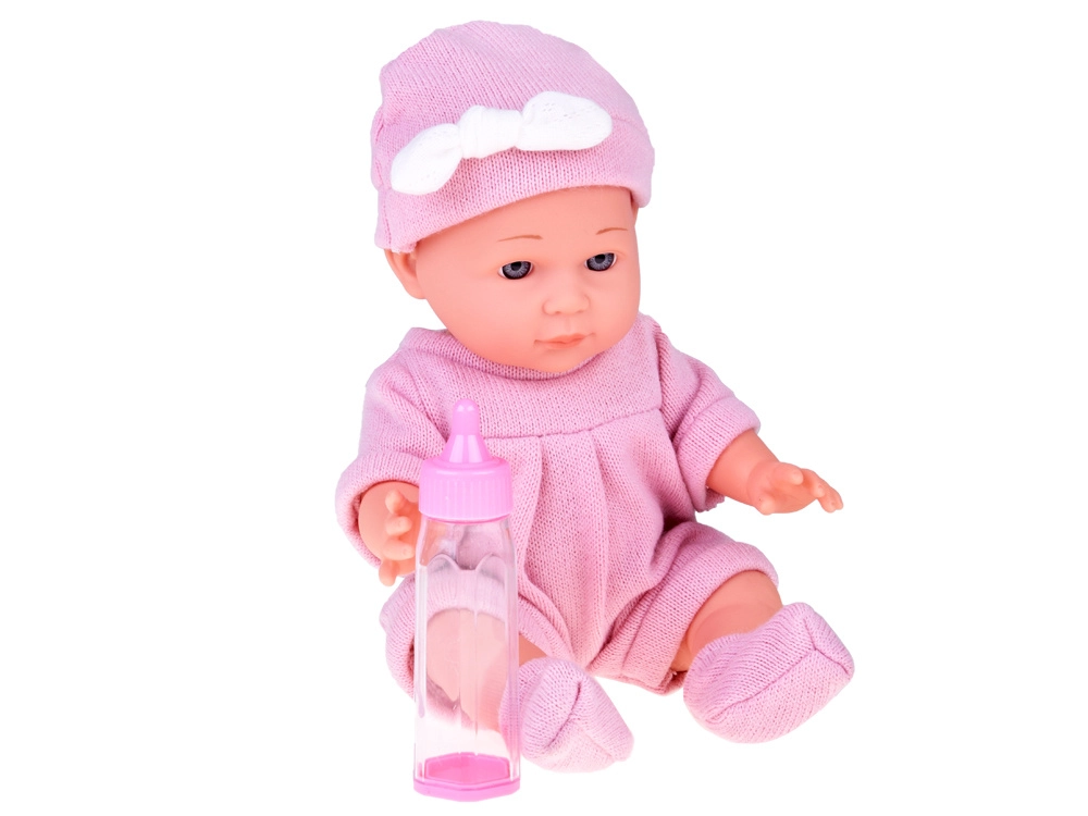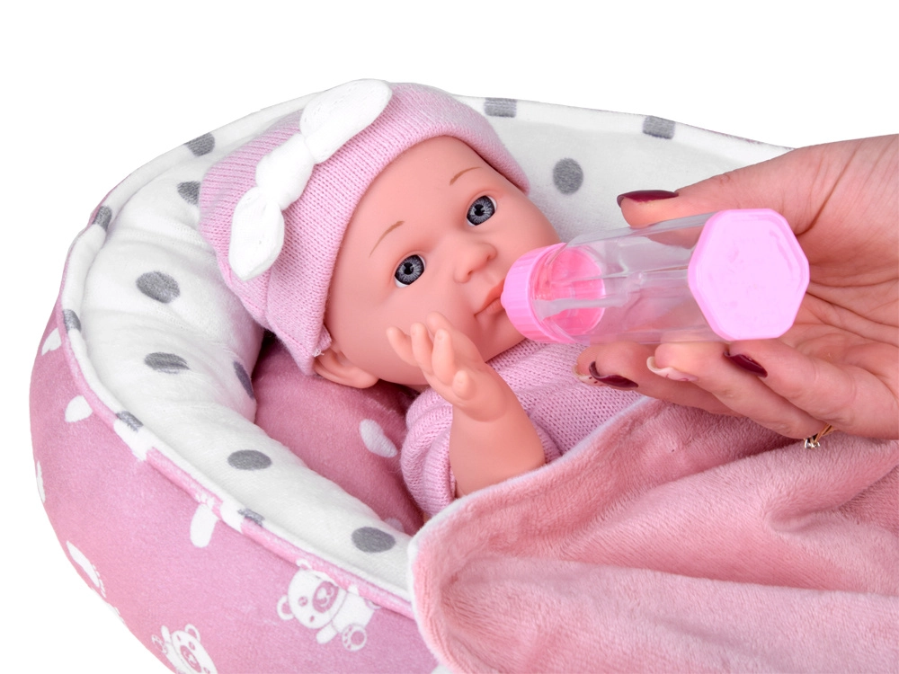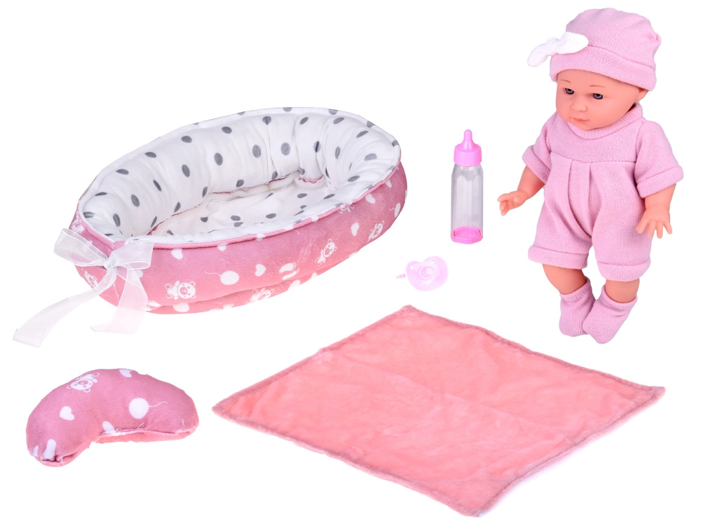 - Lalka w różowym ubranku i czepku, tekstylne gniazdko z poduszeczką i kocykiem, butelka, smoczek