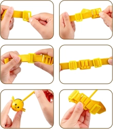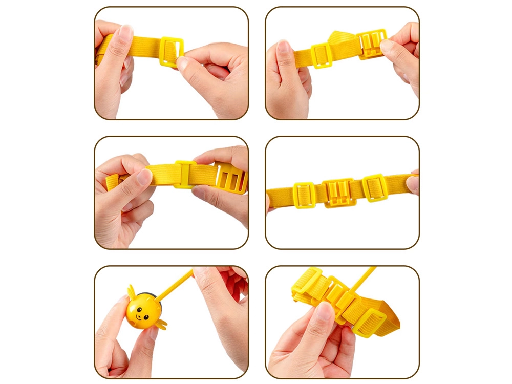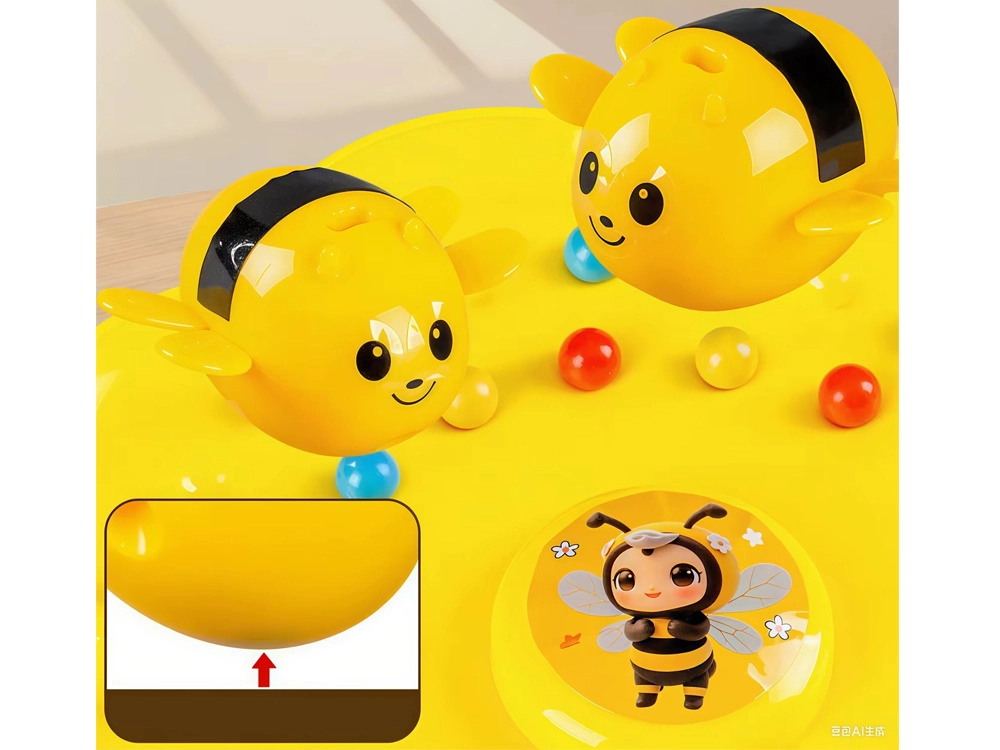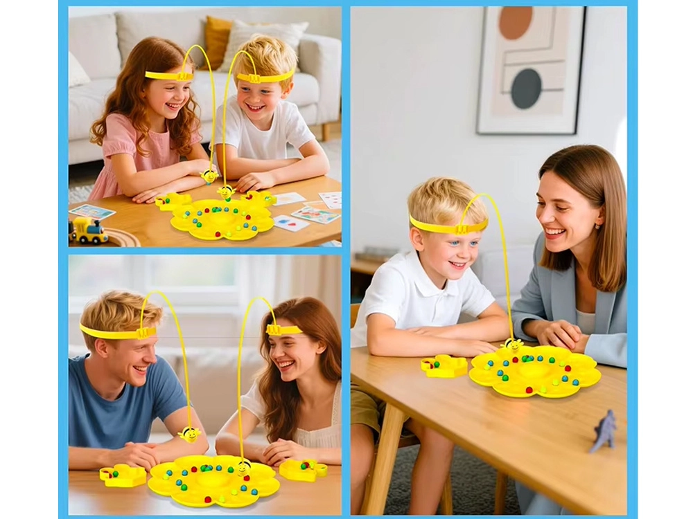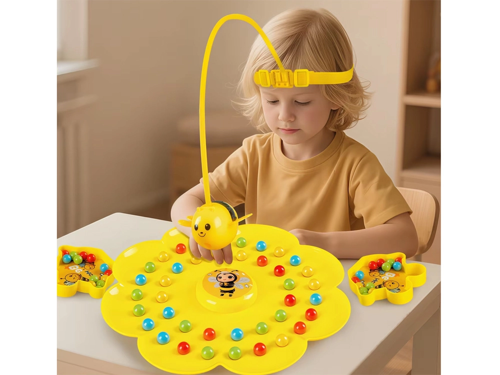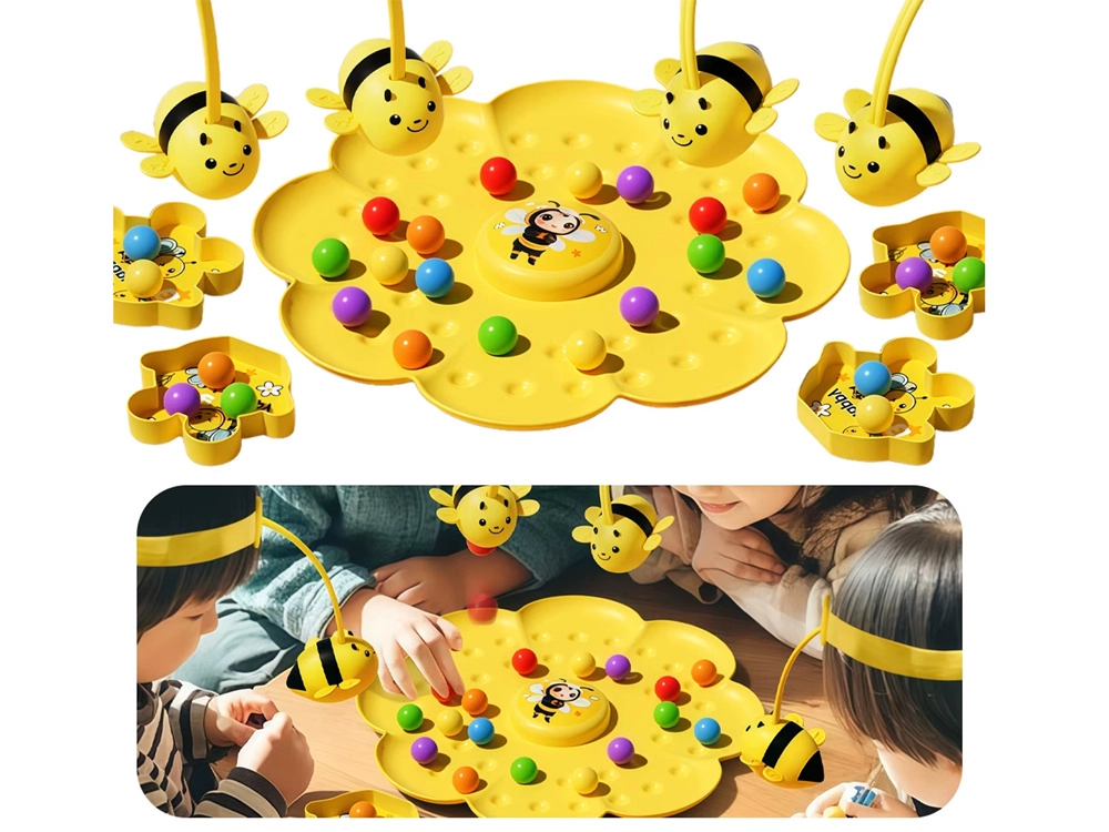 Elastyczny pasek z pałeczką i magnetyczną pszczołą można nosić na głowie lub trzymać w dłoni. Kwiatowa podstawa i miseczki utrzymują grę przejrzyście i w dobrym tempie.