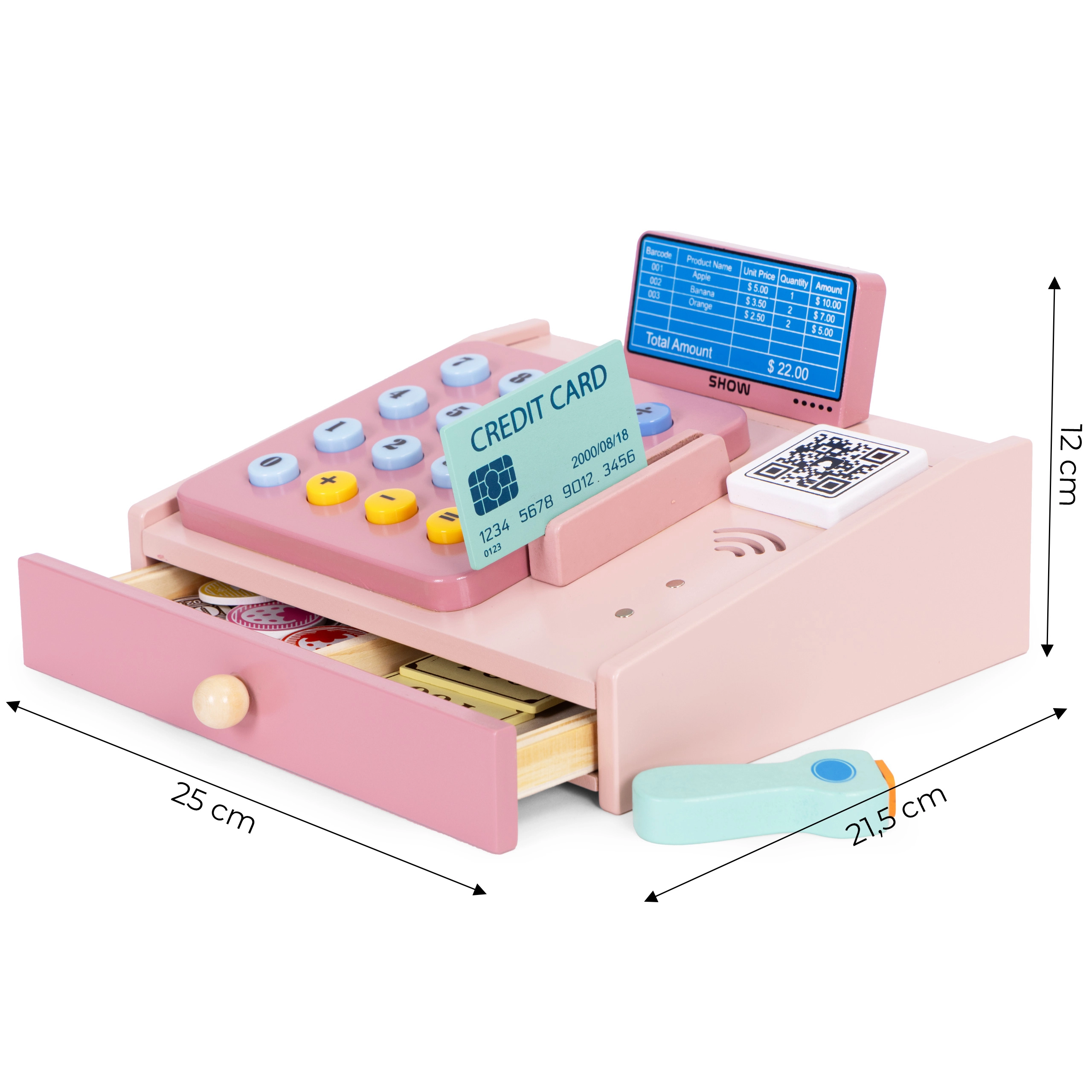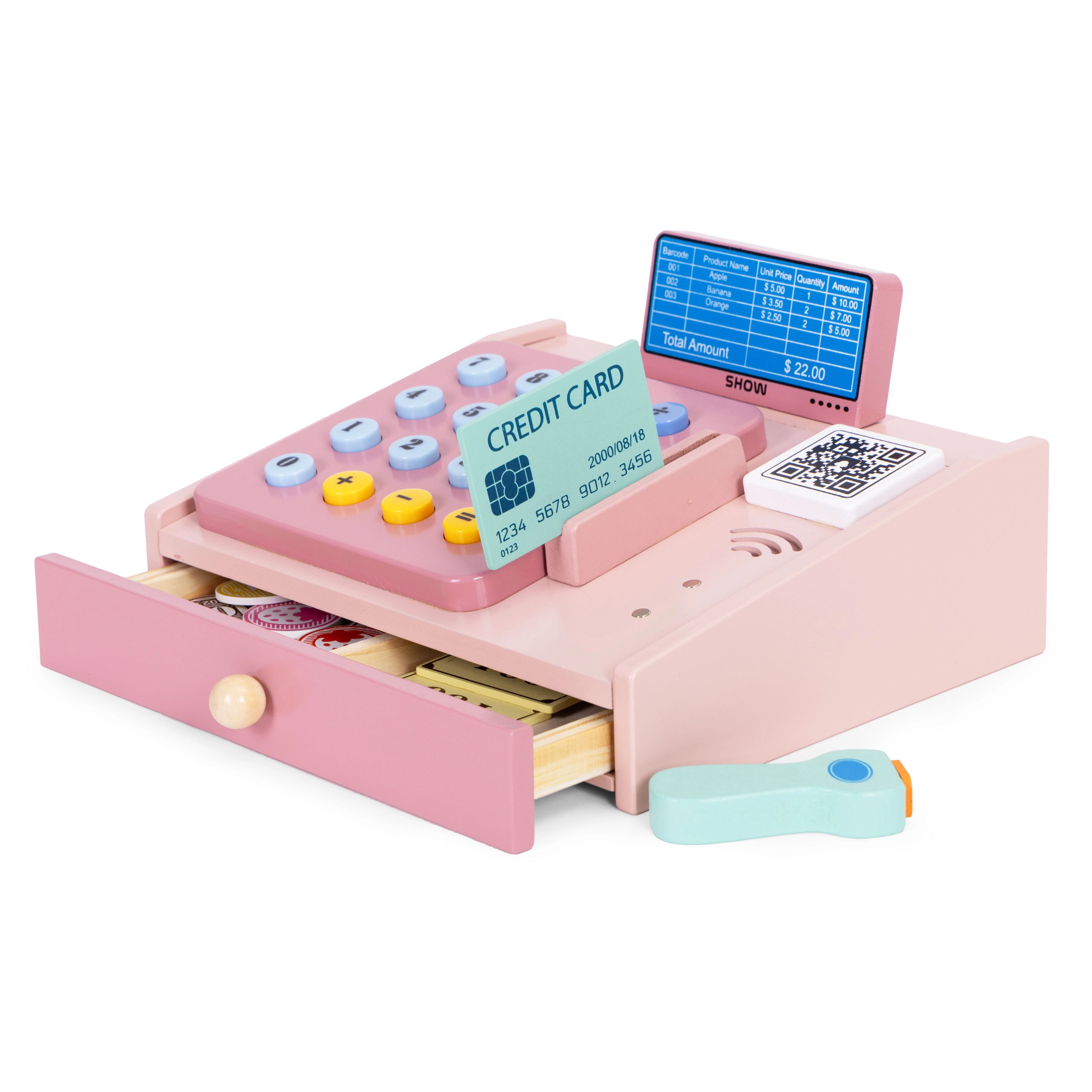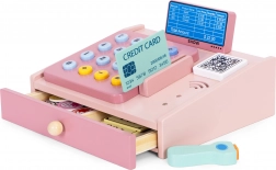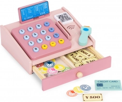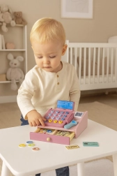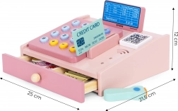 Drewniana kasa dla dzieci ze skanerem, monetami i kartą płatniczą