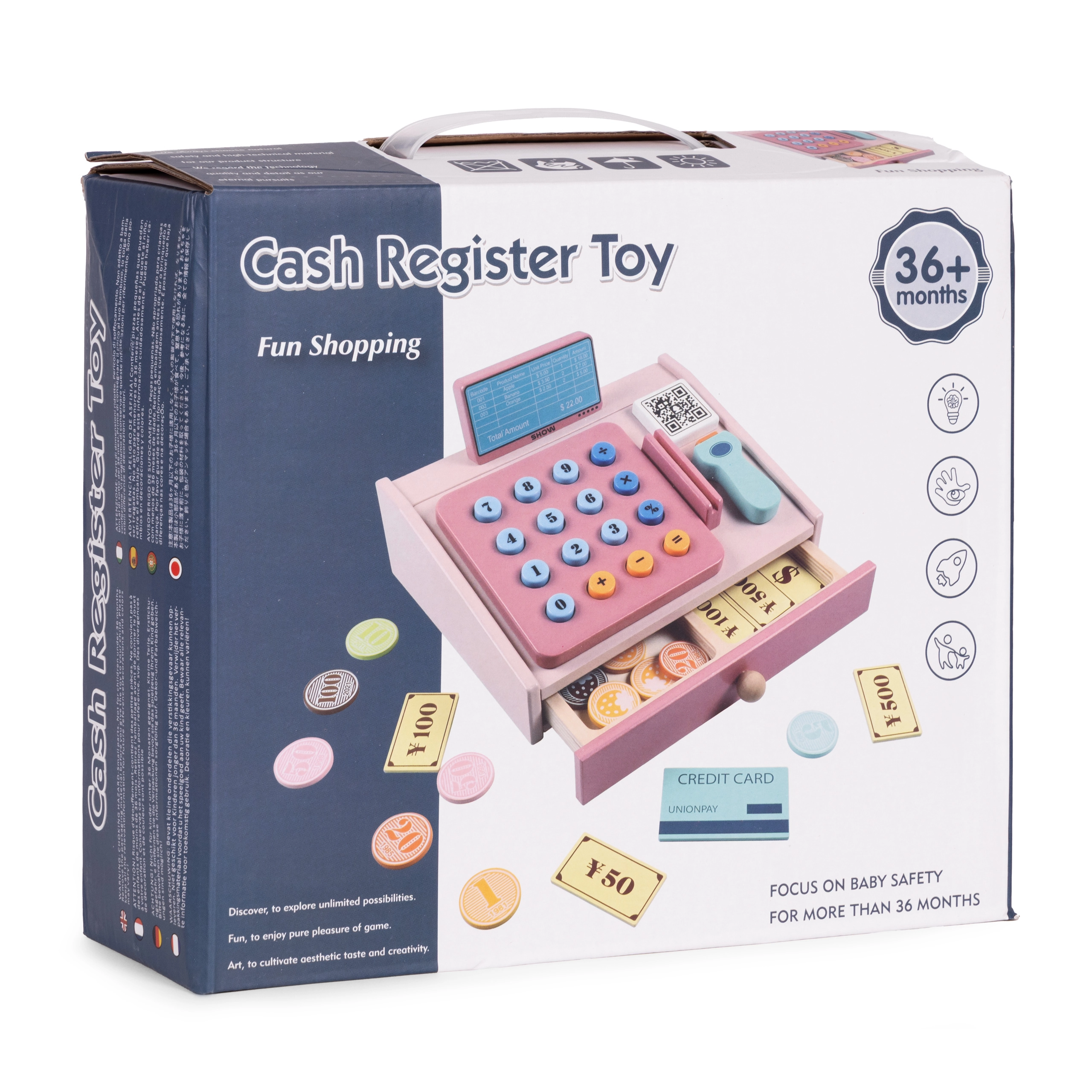 Bezpieczne wykonanie z gładkimi, zaokrąglonymi krawędziami jest odpowiednie dla dzieci od 3 lat. W zestawie znajdują się drewniane monety i banknoty oraz karta płatnicza, aby nic nie stało na przeszkodzie natychmiastowej zabawie. Kasa świetnie wpasuje się w nowoczesne wnętrze i zapewni długie godziny kreatywnej rozrywki.