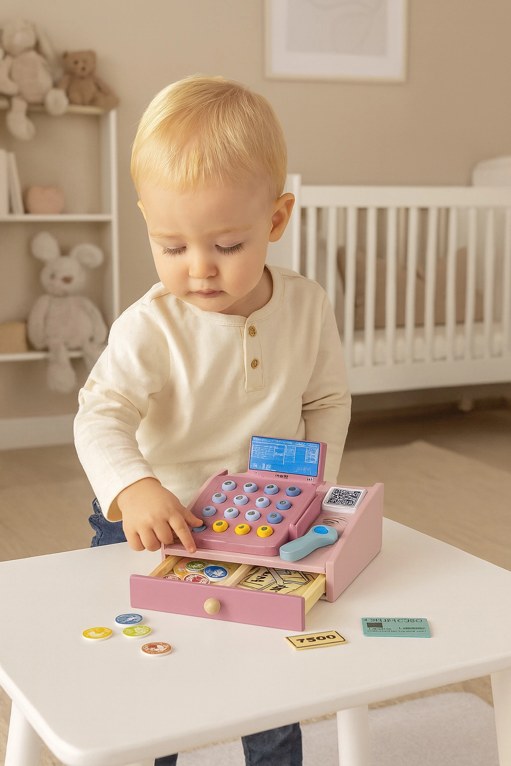 Wysuwana przegródka mieści banknoty i monety, dzięki czemu dzieci mogą ćwiczyć sortowanie i liczenie pieniędzy oraz organizację kasy.