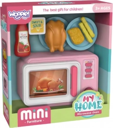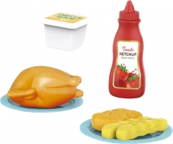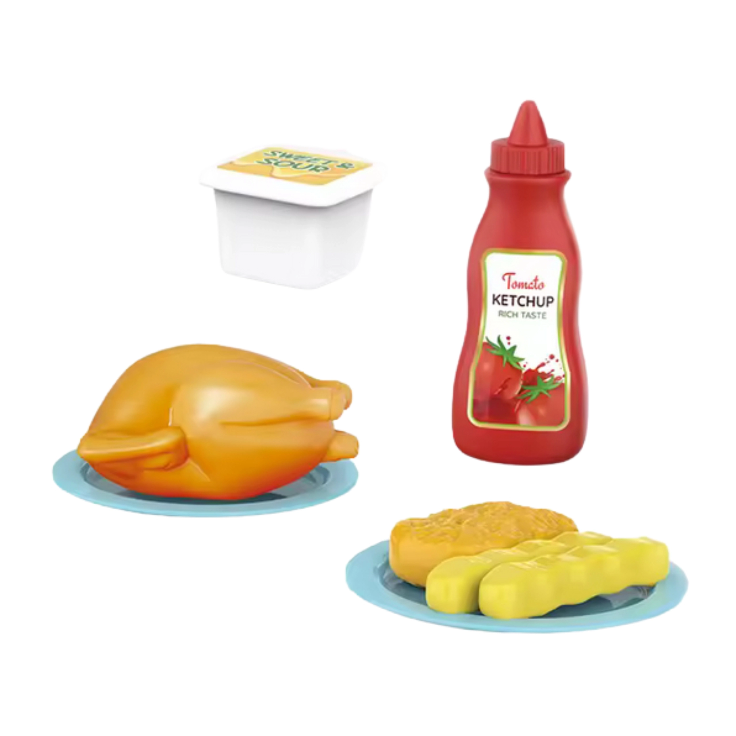 W zestawie znajdziesz: interaktywną kuchenkę mikrofalową, plastikowego kurczaka, 2× frytki, 1× nugget, kubeczek z sosem, butelkę ketchupu, 2 talerzyki.