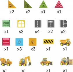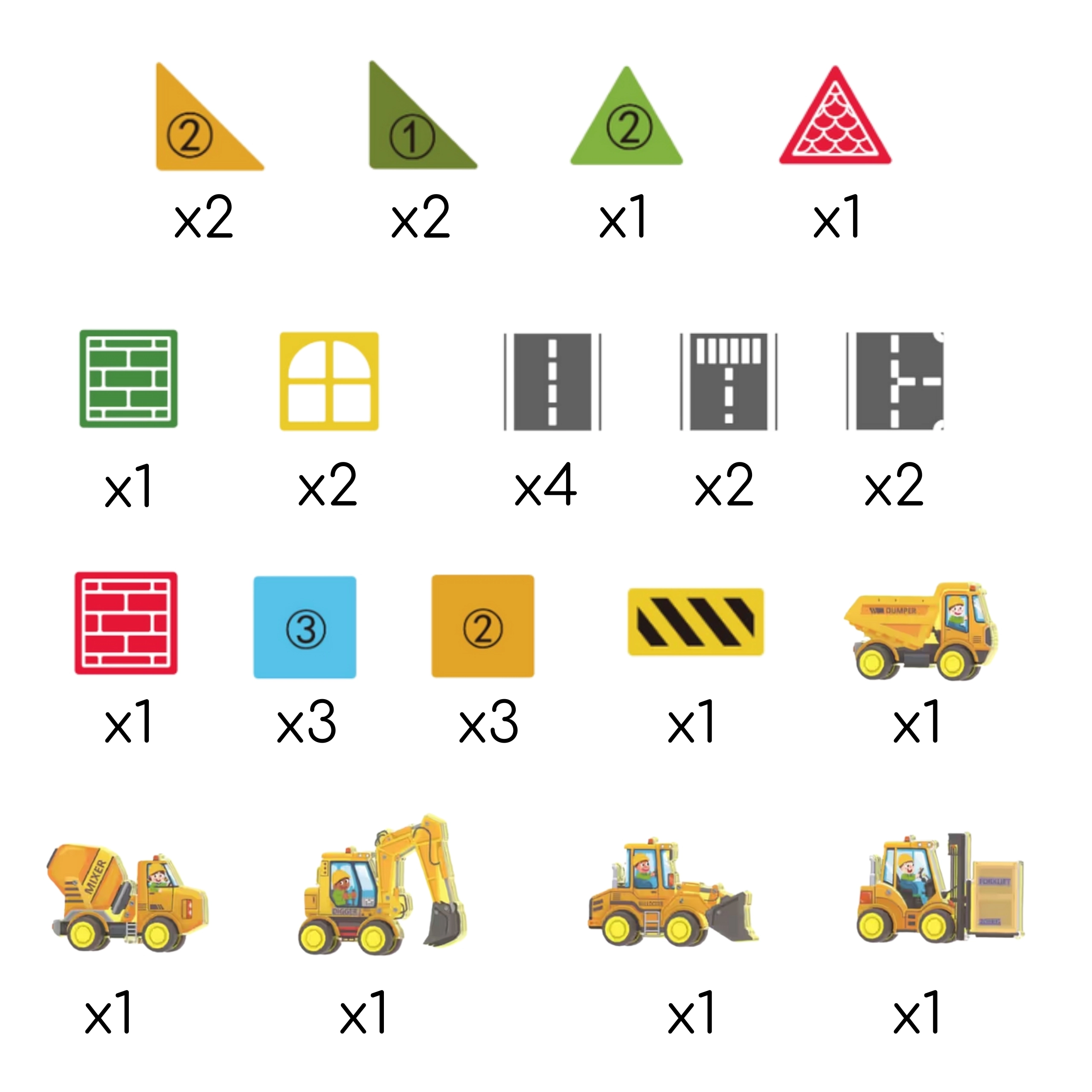 - 12 × kwadrat, 2 × trójkąt, 4 × trójkąt (różne typy), 4 × droga, 2 × okno, 1 × brama