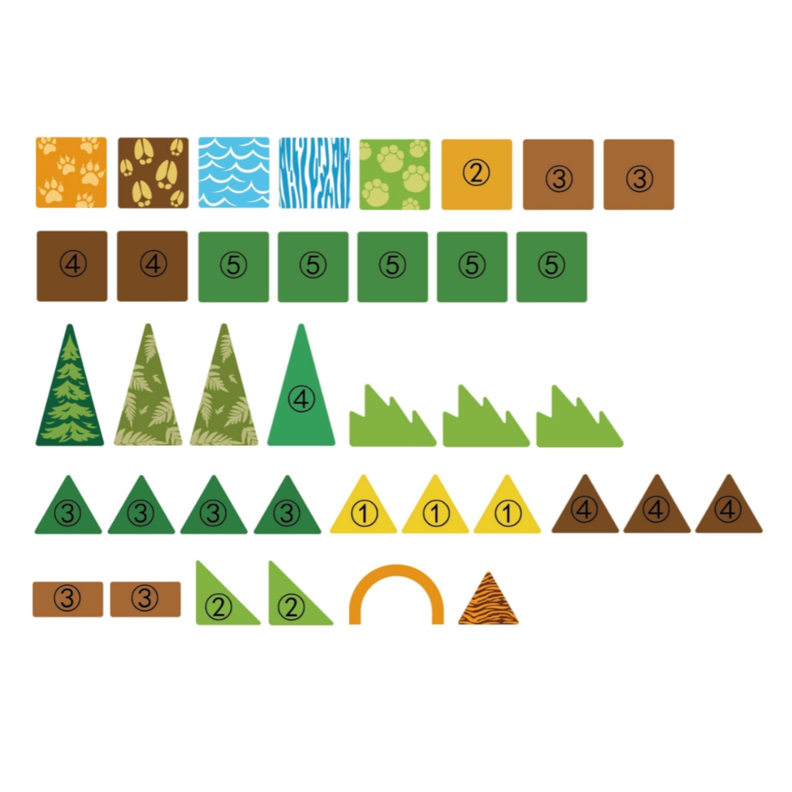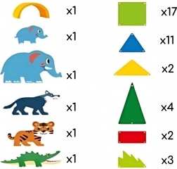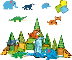magnetyczne płytki (różne kształty i kolory), figurki zwierząt (2× słoń, tygrys, krokodyl, wilk), ruchomy wodospad, łuk, krzewy i drzewa