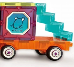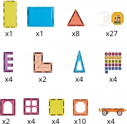 44 magnetyczne elementy, w tym podwozia do pojazdów; 27 elementów ozdobnych (np. okiennice); 2 arkusze naklejek (litery, zwierzęta, przedmioty); instrukcja