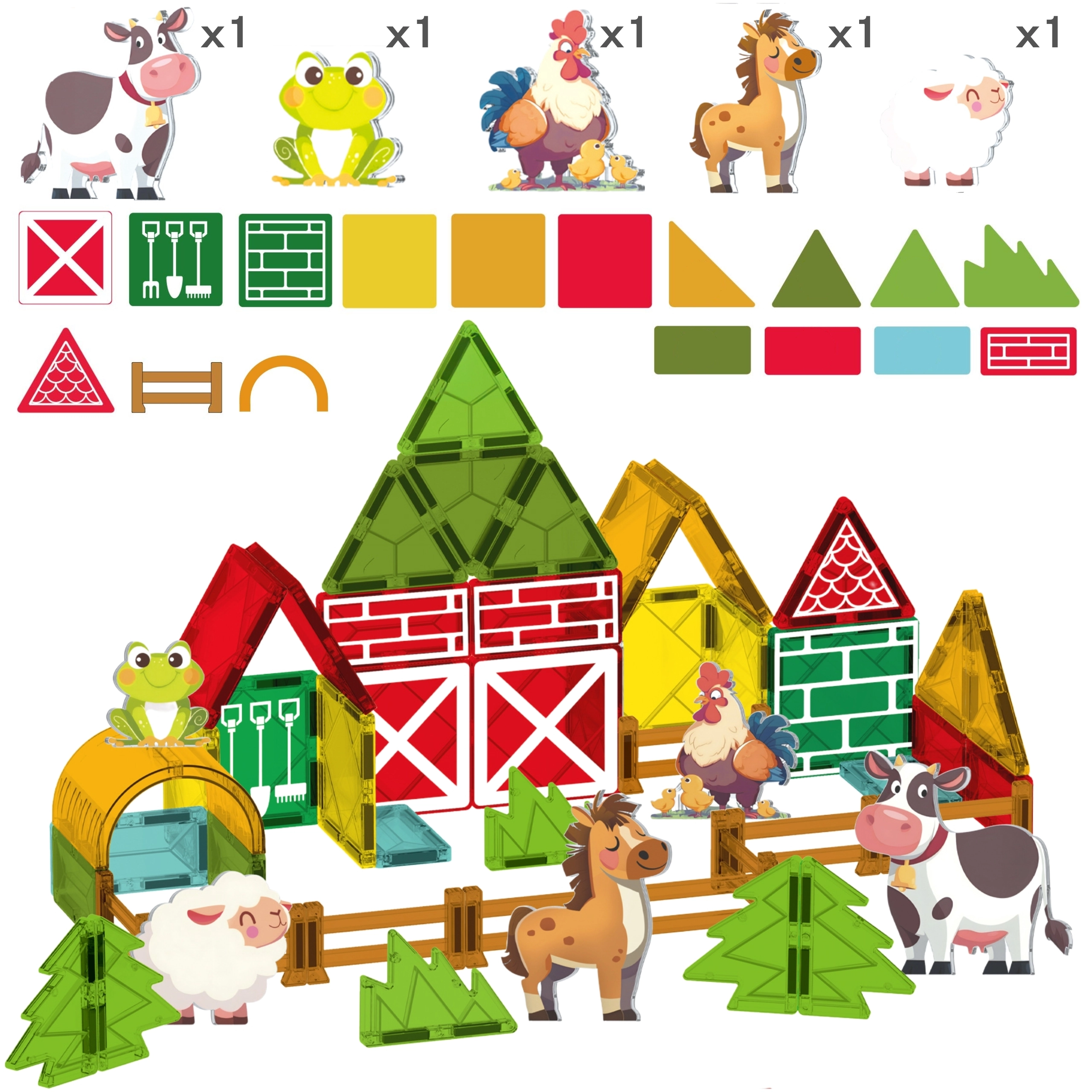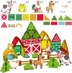 - Co znajdziesz w opakowaniu: 13 kwadratowych magnetycznych elementów, 5 niebieskich trójkątów, 2 żółte trójkąty, 9 czerwonych prostokątów, 1 pomarańczowy półokrąg, 9 płotków, 5 figurek zwierząt (owca, koń, kogut, żaba, krowa) oraz zestaw naklejek.