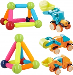 - 10 magnetycznych kulek, 12 krótkich magnetycznych pręcików, 8 wygiętych magnetycznych pręcików, 16 elementów do budowy pojazdów