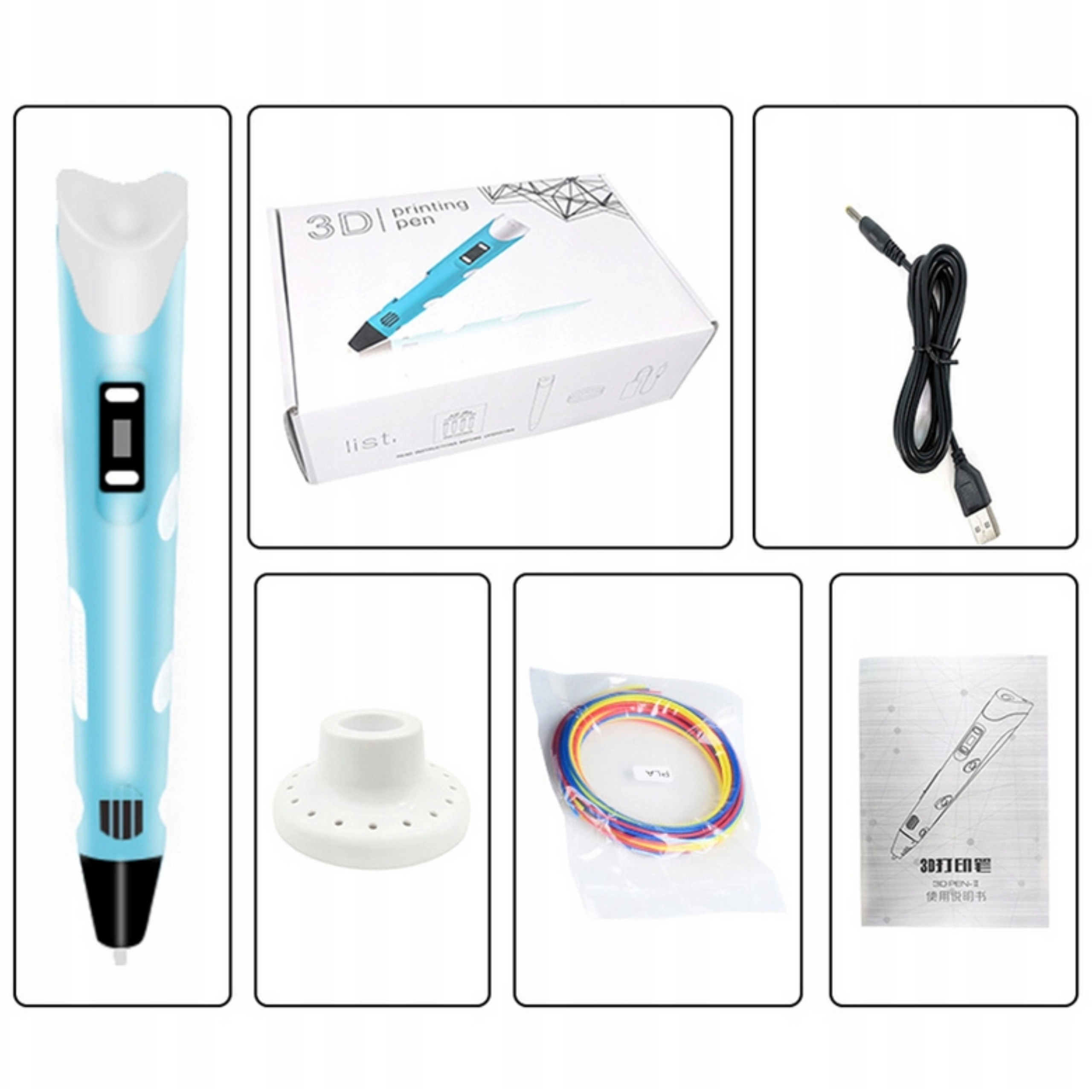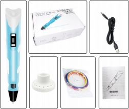 - Długopis 3D (1 szt.), filament PLA 12 × 3 m (różne kolory), kabel USB (1 szt.), instrukcja (EN)