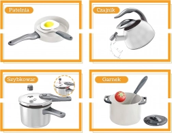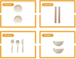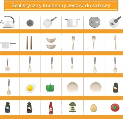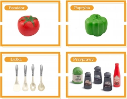 - Garnki z pokrywkami i uchwytami, patelnia z jajkiem sadzonym, czajnik, talerze, miseczki, sztućce (widelce, łyżki, pałeczki, łopatki), solniczka, pieprzniczka, warzywa (pomidor, papryka), buteleczki z sosami/przyprawami