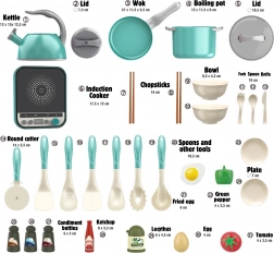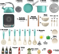 - Bogate akcesoria: garnki z pokrywkami, patelnia z jajkiem, czajnik, talerzyki i miseczki, sztućce, warzywa, przyprawy.
