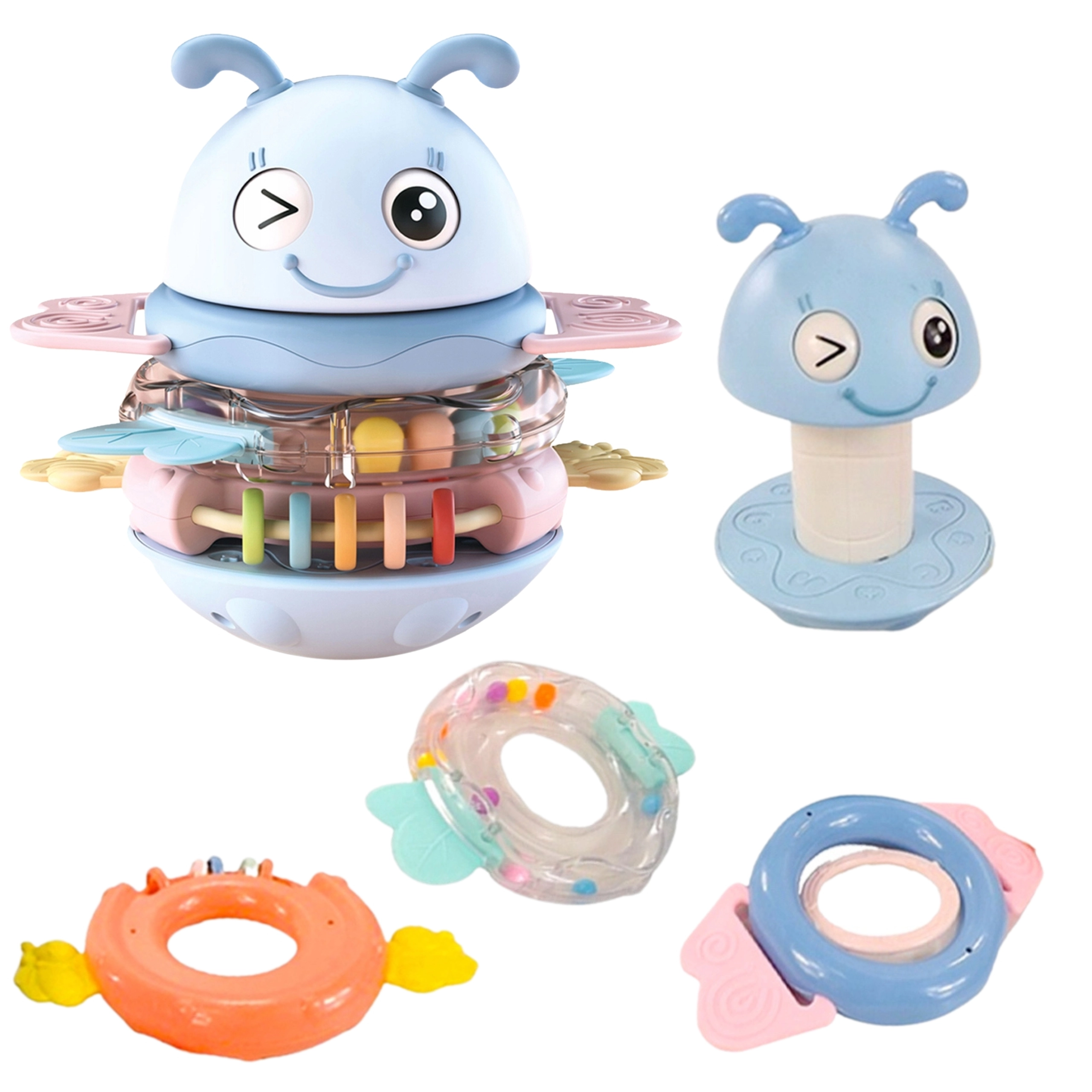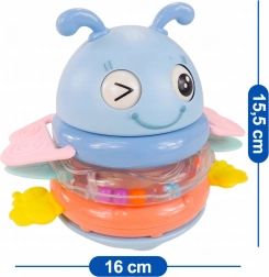 Ta urocza „ważka” przyciąga uwagę maluszków kolorami, ruchem i dźwiękami. Kółka działają jako grzechotki i gryzaki i można ich używać osobno lub układać na paliku z 2 trybami dźwięku (melodie i zabawne efekty). Dzięki miękkim silikonowym wypustkom delikatnie masują dziąsła podczas ząbkowania.