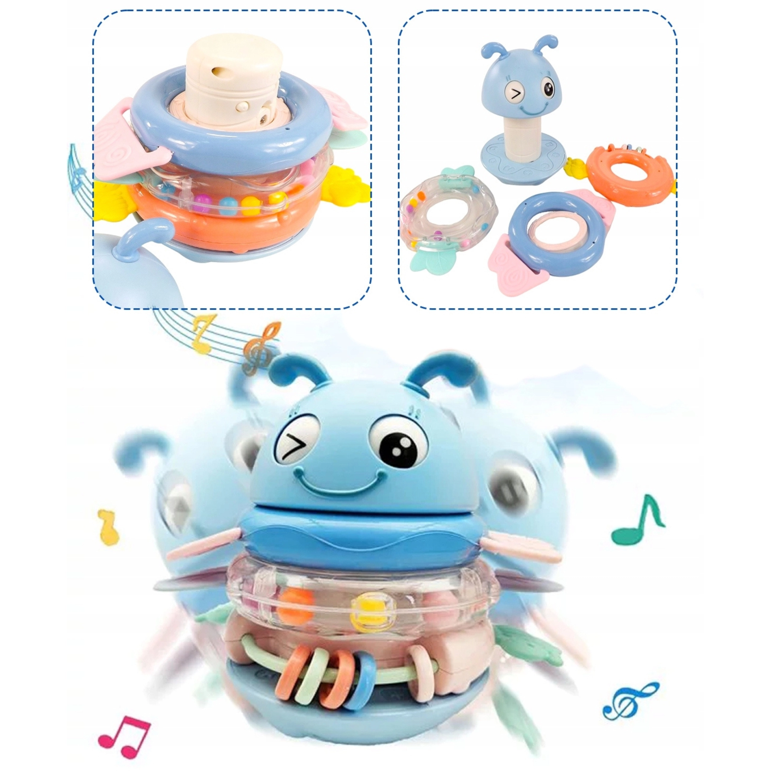 Po nałożeniu każdego kółka zabawka odtwarza melodię lub zabawny dźwięk. Dwa tryby dźwiękowe wspierają stymulację sensoryczną.