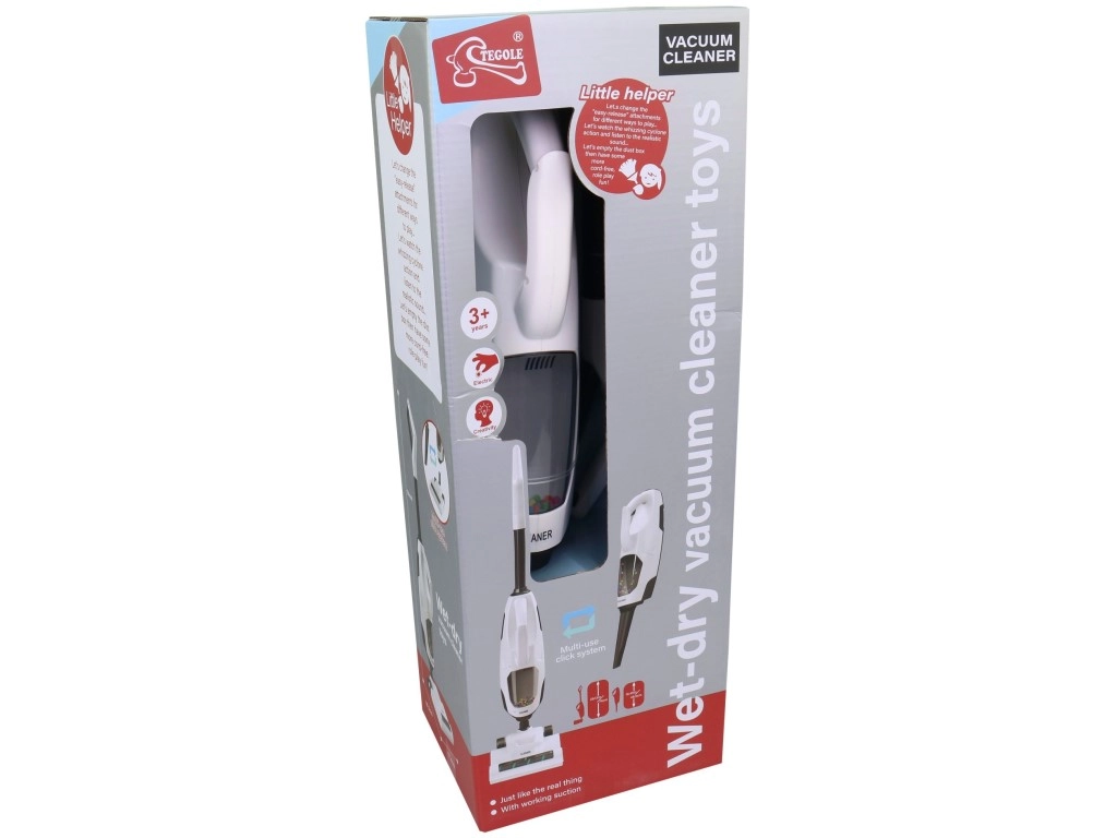 Lekka i wytrzymała konstrukcja z tworzywa sztucznego jest dopasowana do dziecięcych rąk. Odkurzacz jest zasilany 3× bateriami AA 1,5 V (brak w zestawie) i jest odpowiedni dla dzieci od 3 lat.