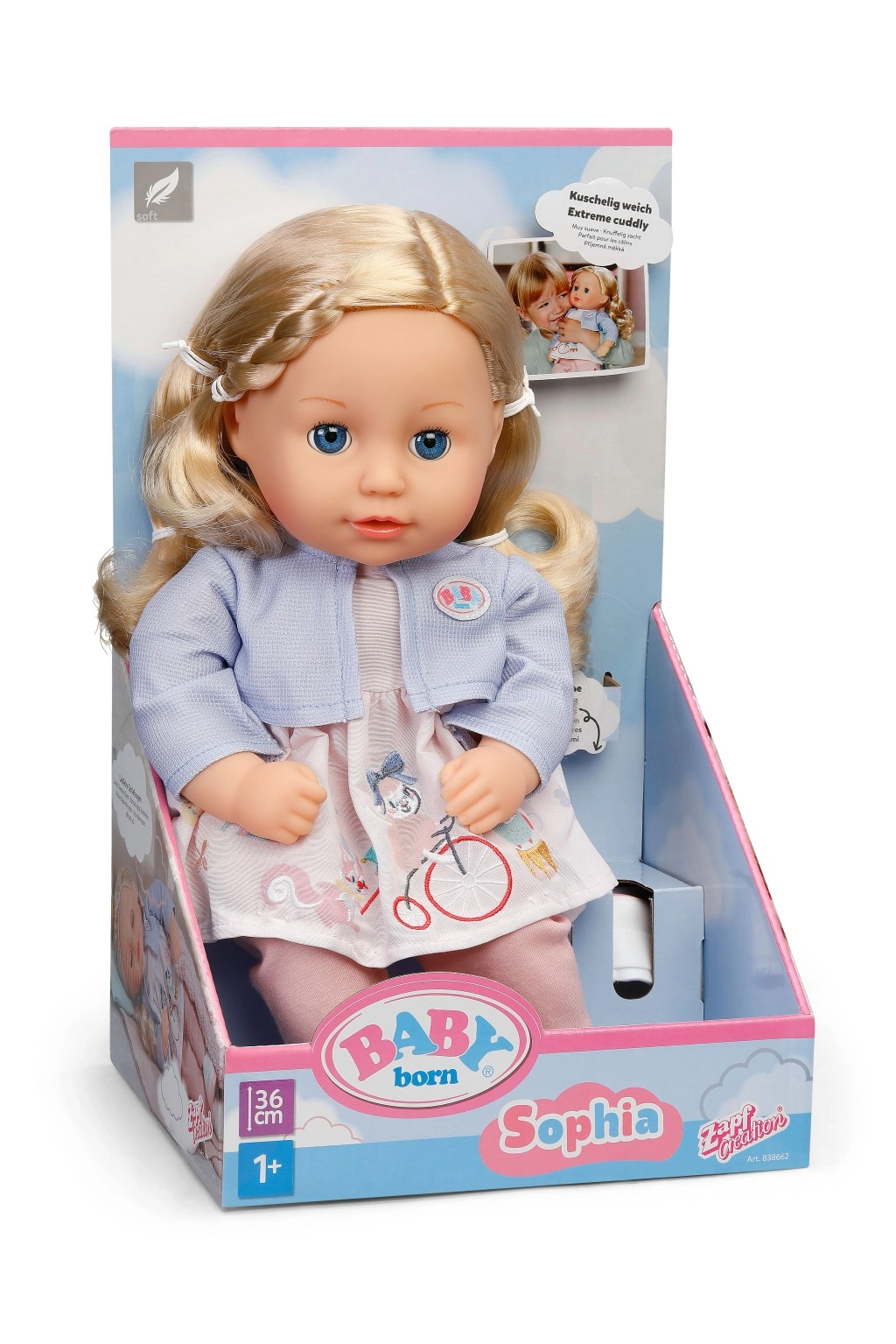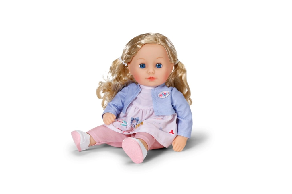 Urocza lalka BABY born Sophia o wysokości 36 cm ma miękkie ciałko do przytulania, mrugające oczy oraz wysokiej jakości włosy do czesania i stylizacji. W zestawie stylowe ubrania – sukienka z kurteczką, legginsy i buty. Świetna pierwsza lalka od 1. roku życia wspierająca rozwój wyobraźni i umiejętności opiekuńczych.