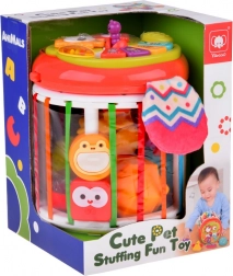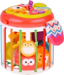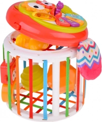 Interaktywna sowa 2w1 oferuje dwie zabawy w jednym: część elektroniczną z przyciskami zwierzątek i dźwiękami oraz samodzielny kolorowy sorter. Po włączeniu odtwarza melodię powitalną, a poszczególne przyciski aktywują nazwy dźwięków, odgłosy zwierząt, krótkie instrumentalne melodie i wesołe piosenki. Dzieci polubią obracające się oczy, ruchome skrzydełka z koralikami, miękki szeleszczący ogonek oraz wysuwanego „robaczka” na gumce.