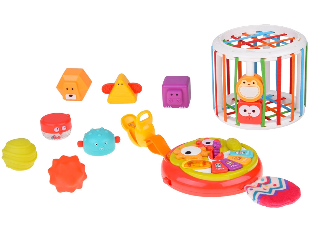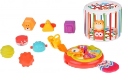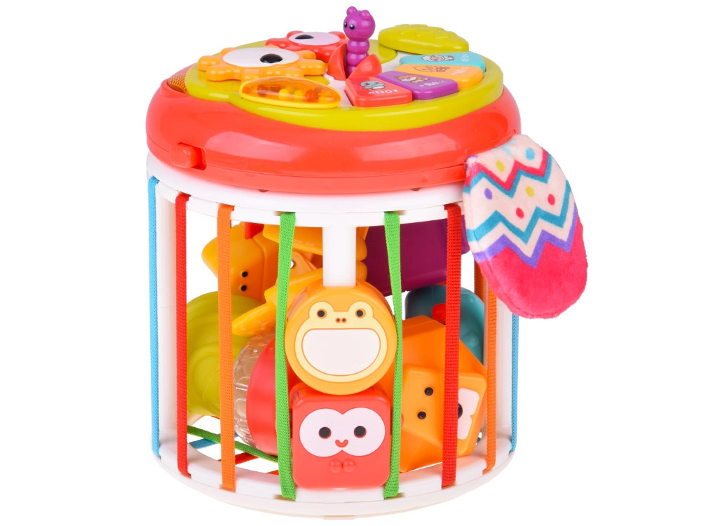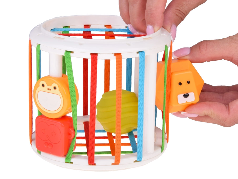 Sorter tworzą elastyczne kolorowe paski, które ułatwiają wkładanie i wyjmowanie elementów, dzięki czemu naturalnie rozwijają chwyt, siłę i precyzję palców. Nie zabrakło małego bezpiecznego lusterka do odkrywania własnego odbicia oraz zestawu 7 kolorowych elementów do sortowania. Całość stymuluje słuch, wzrok i dotyk, wspiera koncentrację i samodzielne odkrywanie.