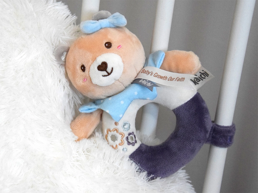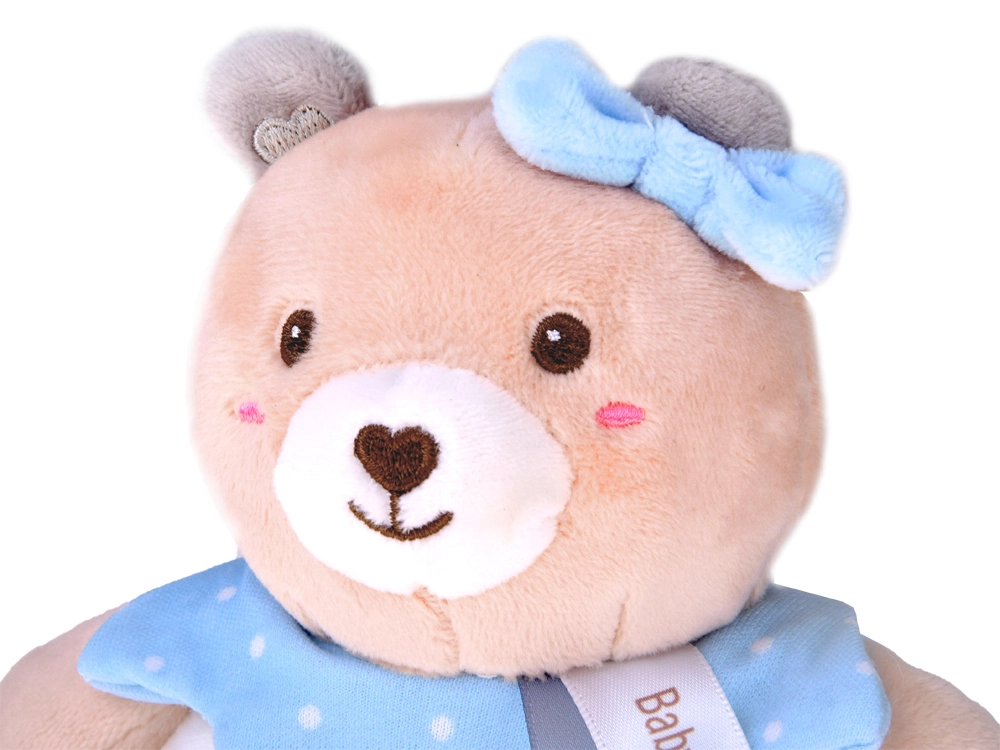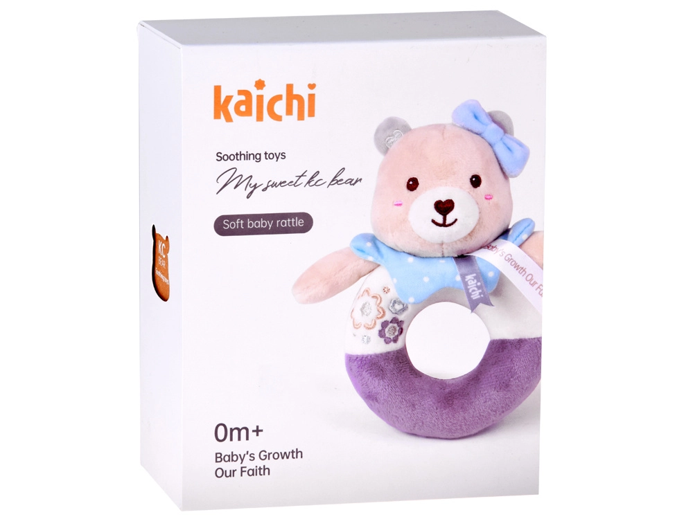 Pluszowa grzechotka miś została uszyta z wysokiej jakości, bardzo miękkich materiałów przyjemnych w dotyku. Kształt kółka ułatwia łatwe chwytanie i trzymanie, dzięki czemu jest idealna do pierwszych prób ćwiczenia chwytu. Delikatne, haftowane detale (oczka, pyszczek, ozdoby) zapewniają maksymalne bezpieczeństwo bez drobnych części.