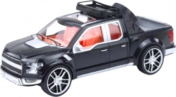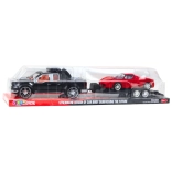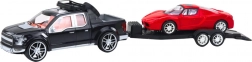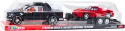 Czarny pick‑up z przyczepą i czerwonym sportowcem tworzą realistyczny zestaw do tematycznej zabawy.