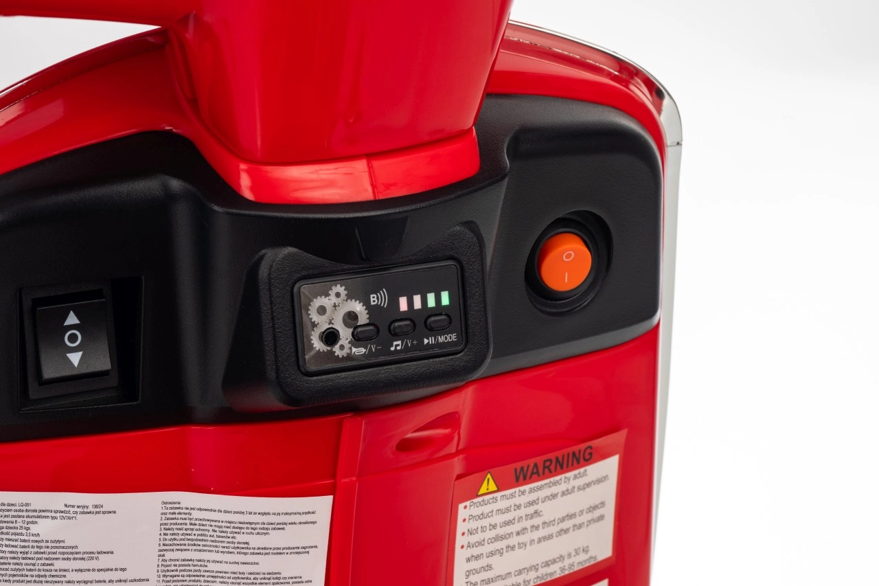 Mali kierowcy będą się świetnie bawić z wbudowanym panelem audio – odtwarzaj ulubione piosenki przez Bluetooth, MP3 lub AUX. Na kierownicy znajdują się przyciski dźwięków i klakson, a siedzisko z ekoskóry zapewnia wygodę nawet podczas dłuższej jazdy. Wskaźnik naładowania baterii poinformuje, kiedy nadchodzi czas na doładowanie.