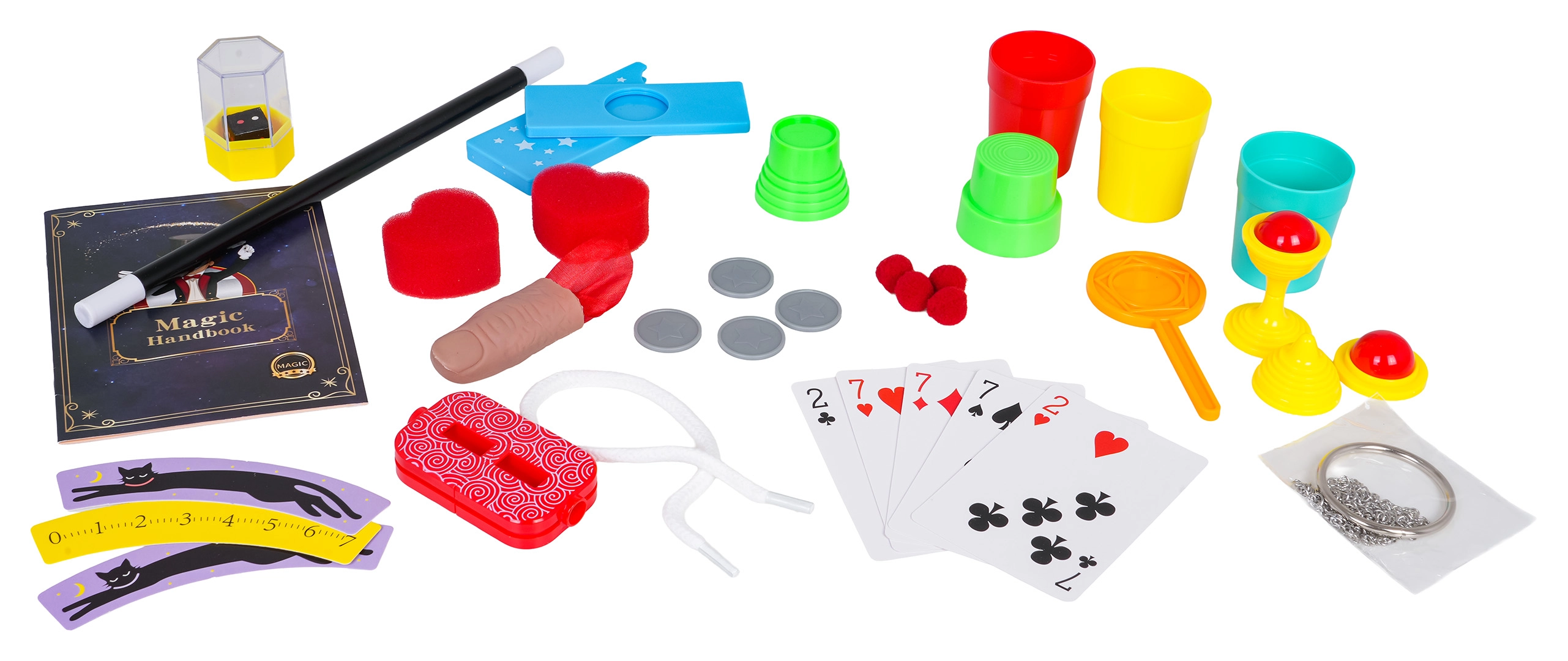 W opakowaniu znajdziesz różnorodne akcesoria magiczne – od magicznej różdżki, kubeczków i monet po specjalne rekwizyty do żonglowania uwagą publiczności. Każdy trik jest klarownie wyjaśniony i dostosowany do dzieci, aby mogły cieszyć się sukcesem i budować pewność siebie.