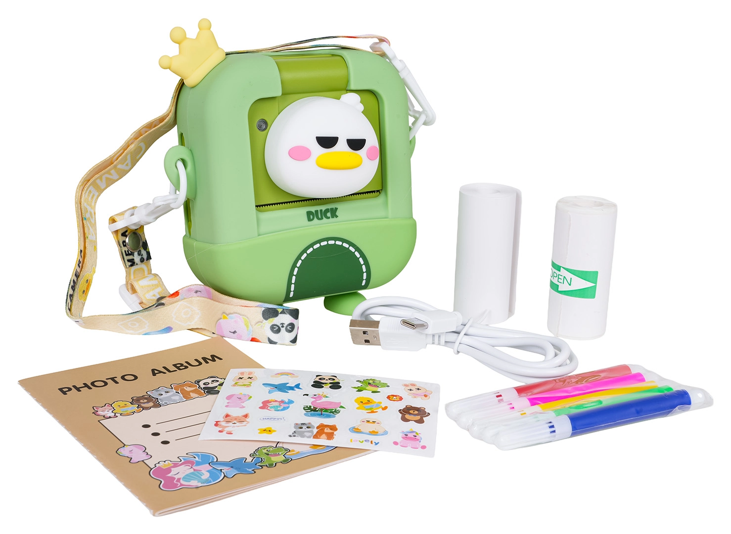 Aparat z motywem kaczuszki, etui ochronne, 2× rolka papieru termicznego, smycz, kabel USB, fotoalbum, 5 flamastrów, naklejki, dekoracyjne samoprzylepki, instrukcja