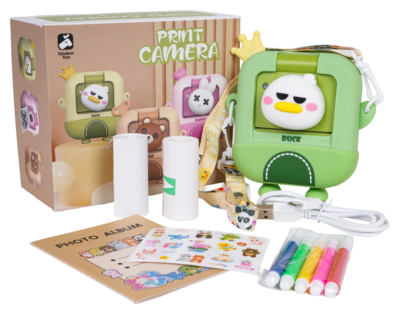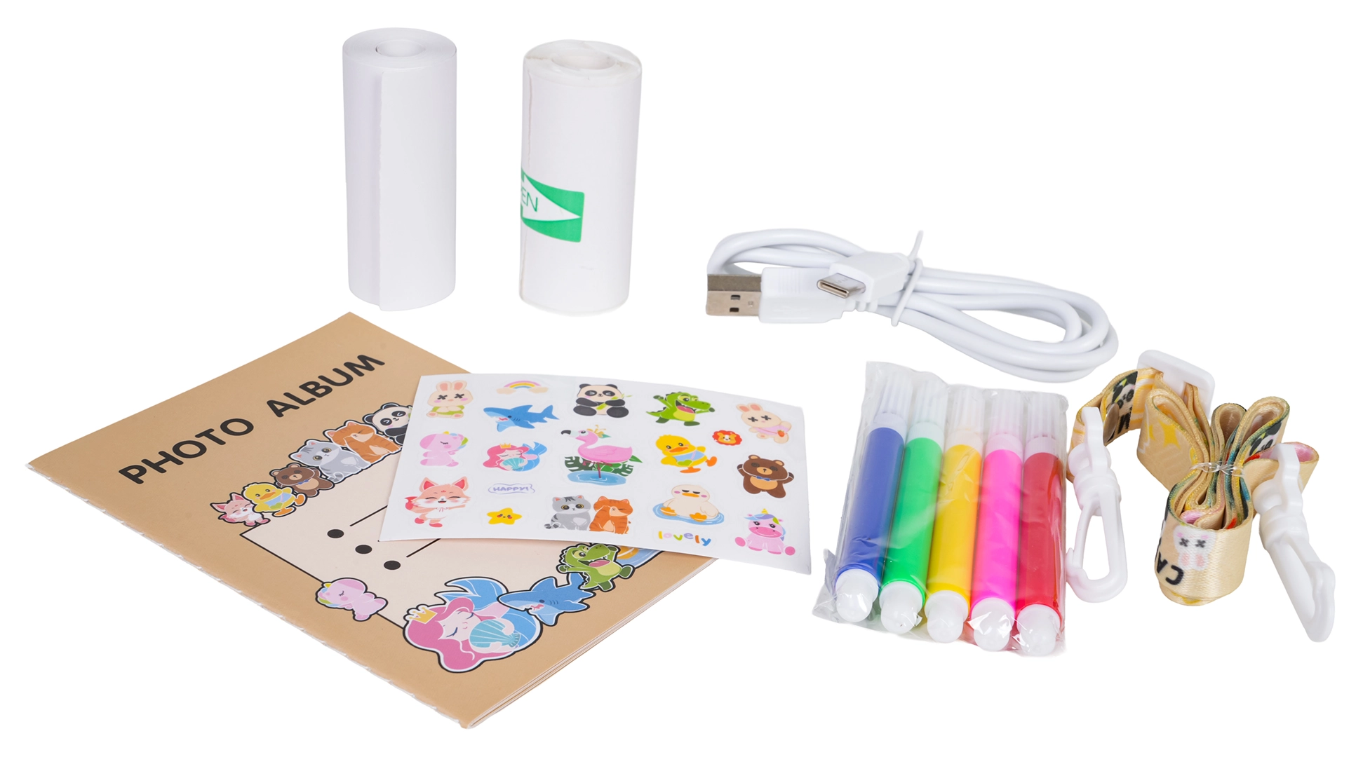 Fotoalbum, 2 rolki papieru, kabel USB, smycz, naklejki i 5 kolorowych flamastrów – kompletny zestaw do tworzenia własnych wspomnień.