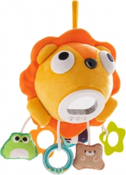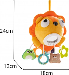 Na ciele lwa znajdują się 3 przyciski sterujące do włączania i wyłączania podświetlenia, zmiany melodii oraz regulacji głośności. W zestawie są zawieszki o różnych kształtach – w tym gryzak i grzechotka – a także lusterko, które wspiera eksplorację oraz koordynację oko–ręka.