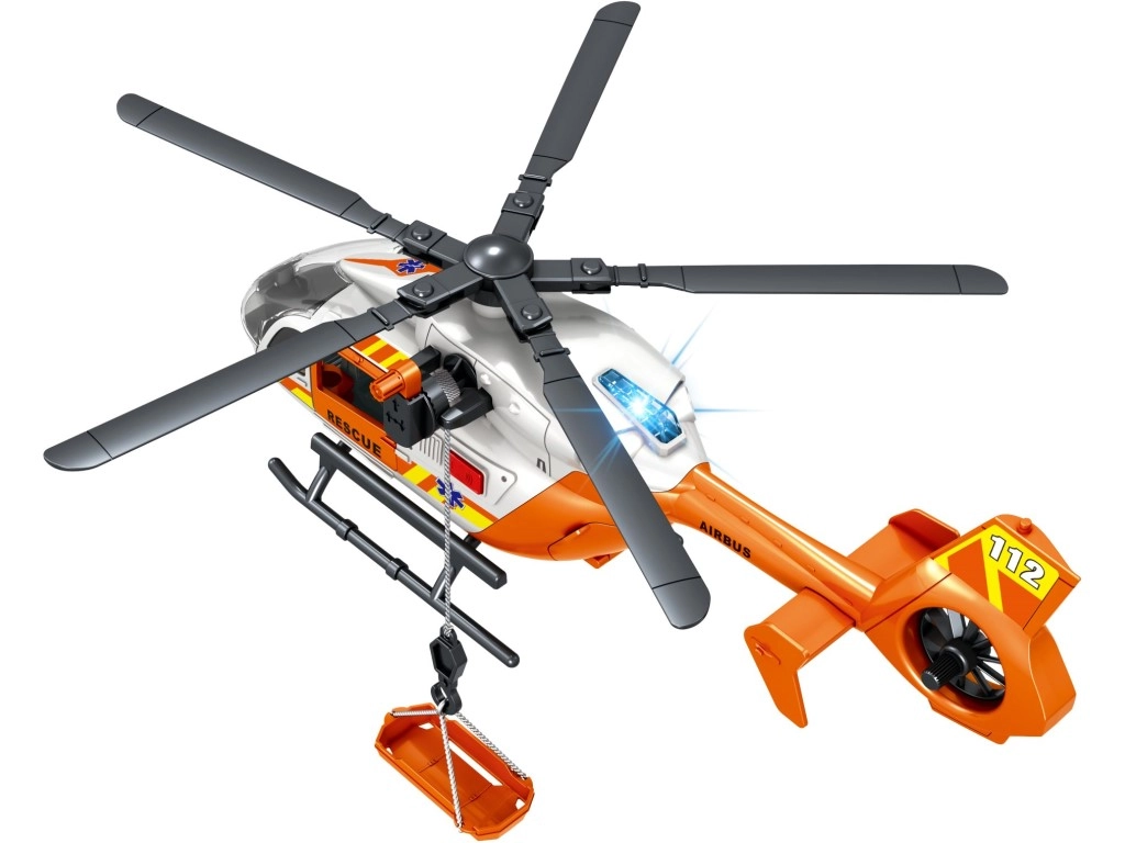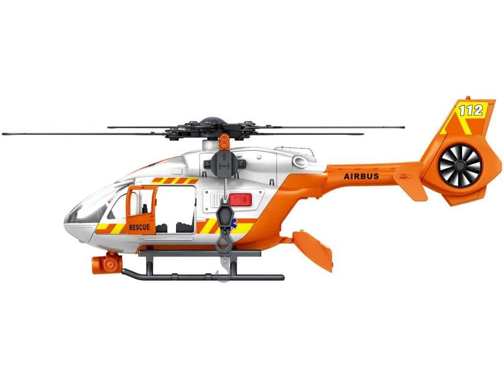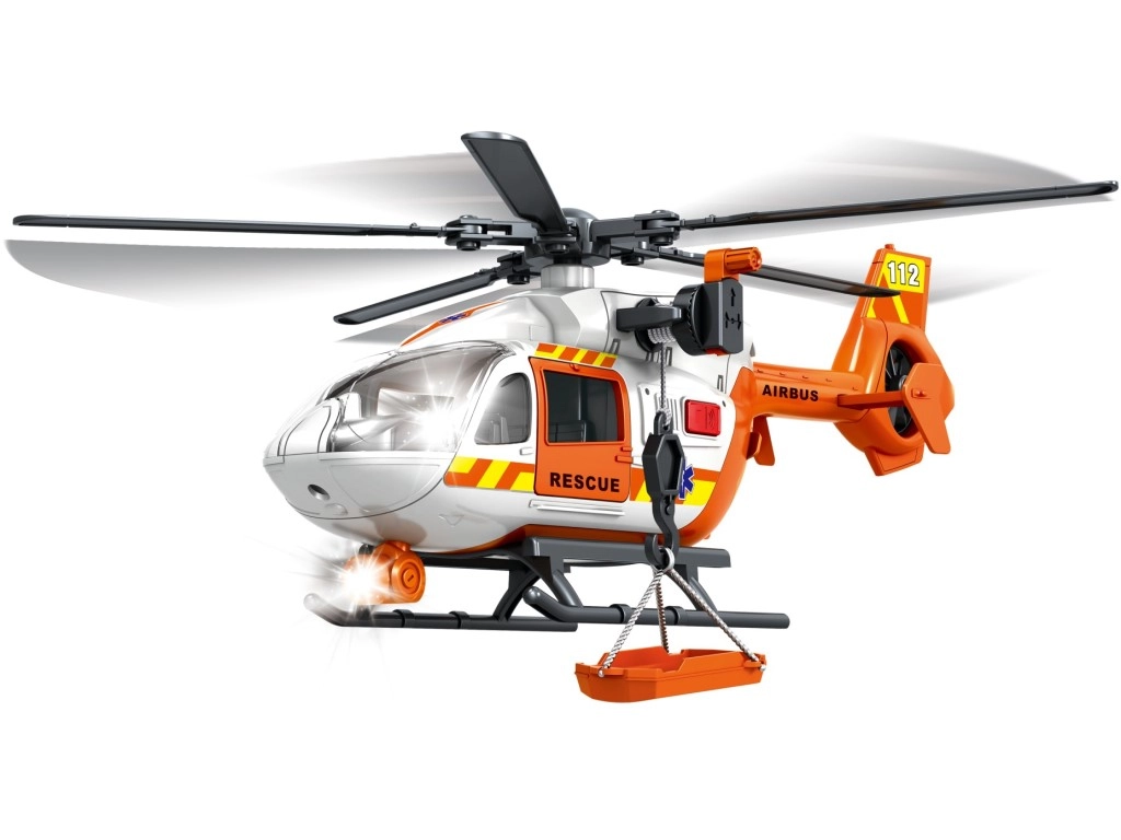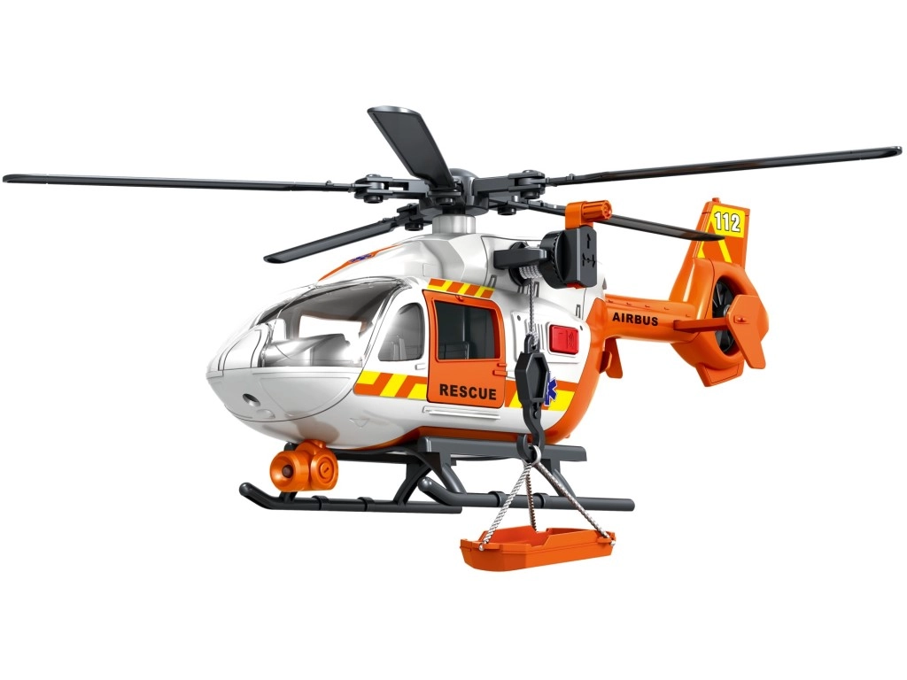 Ten szczegółowo wykonany ratunkowy śmigłowiec w biało‑pomarańczowej kolorystyce zapewnia dzieciom autentyczną zabawę. Dzięki obracającym się wirnikom, składanym płozom oraz funkcjonalnej wciągarce z koszem lub noszami dzieci łatwo odegrają prawdziwe akcje i transport poszkodowanych.