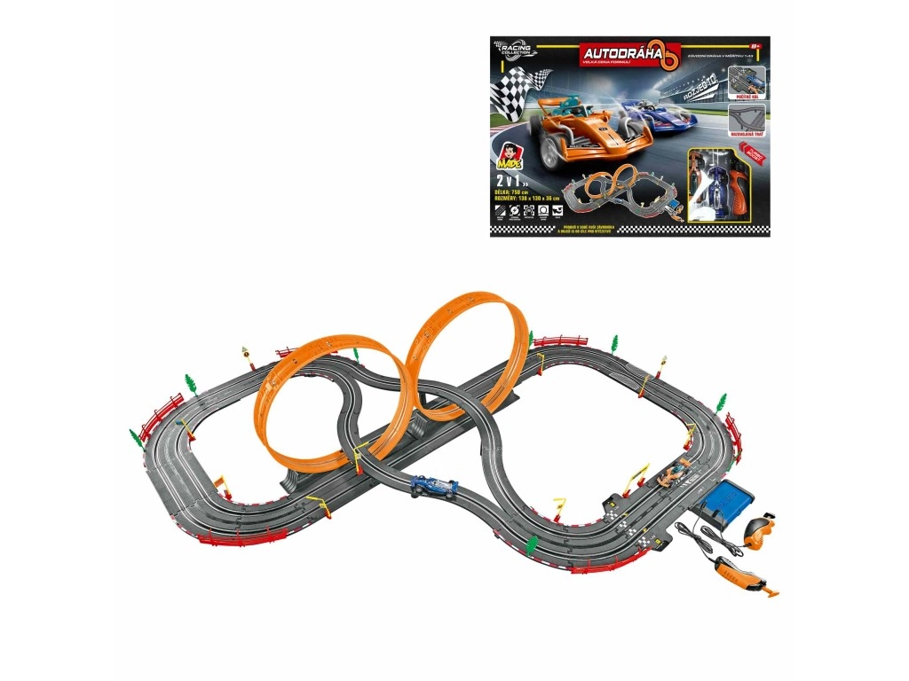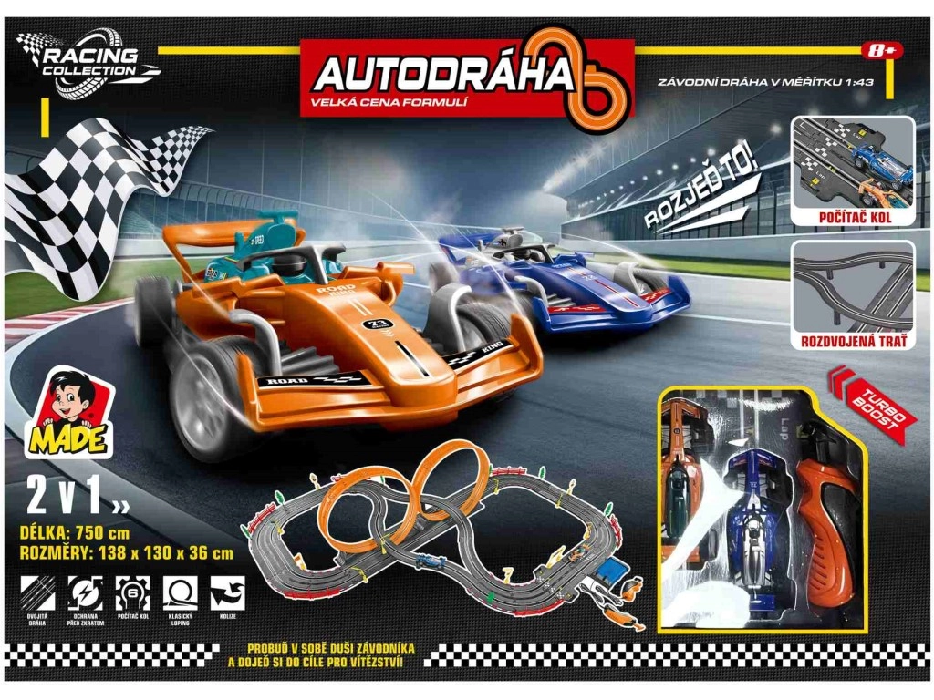 Ten autodrom z bolidami zamieni salon w tor wyścigowy. Dzięki solidnej konstrukcji i przemyślanemu układowi oferuje dynamiczne wyścigi, łatwe sterowanie i natychmiastową gotowość do jazdy dzięki dołączonemu zasilaczowi 12 V. Wymiary złożonego toru 138 × 130 × 36 cm zapewniają dużo miejsca na pełne akcji przejazdy.