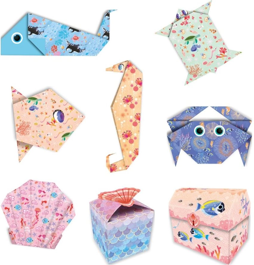 Z nadrukowanych papierów łatwo złożysz rybki, żółwia, kraba, konika morskiego, a także małe pudełeczka i szkatułki na skarby.