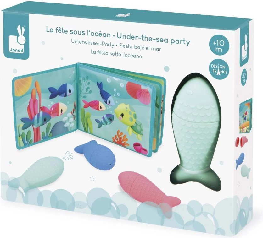 1× wodoodporna książeczka do kąpieli „Oceaniczne party”, 3× zabawka–psikawka w kształcie rybki