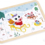 Odkryj zabawne drewniane puzzle JANOD z motywem zimowych uciech, które zapewnią dzieciom godziny twórczej zabawy. Puzzle na drewnianej planszy z frezowaną krawędzią ułatwiają układanie, rozwijają małą motorykę, logiczne myślenie i wyobraźnię. Po ułożeniu obrazka dzieci mogą dodatkowo ćwiczyć spostrzegawczość dzięki aktywności wyszukiwania różnic.