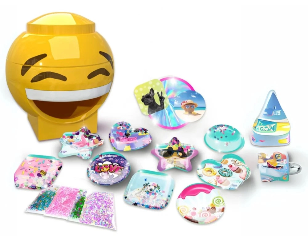 W opakowaniu znajdziesz wszystko, czego potrzeba – od urządzenia do produkcji naklejek po formy, szablony i folie ochronne. Różne ozdoby, takie jak brokat, kamyczki i posypki, nadają naklejkom efektowny wygląd i oryginalną fakturę.