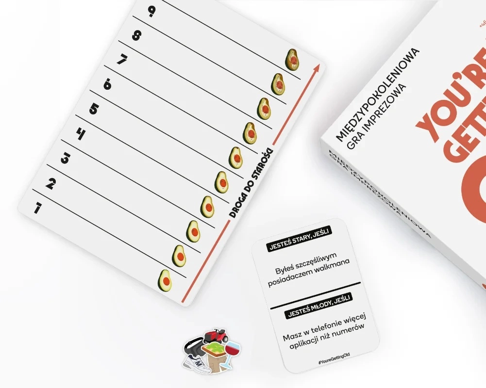 „You’re Getting Old” to nieszablonowa gra karciana, która zamieni każdy wieczór ze znajomymi w salwę śmiechu. Losuj karty z hasłami o tym, co jest „młode”, a co już „starej daty”, i w zależności od własnych reakcji przesuwaj się po planszy do przodu lub do tyłu. Wygrywa ten, kto nie da się ściągnąć do mety i utrzyma się jak najbliżej startu.