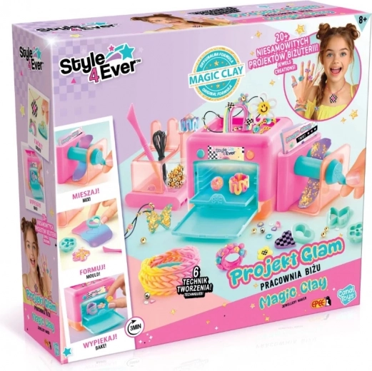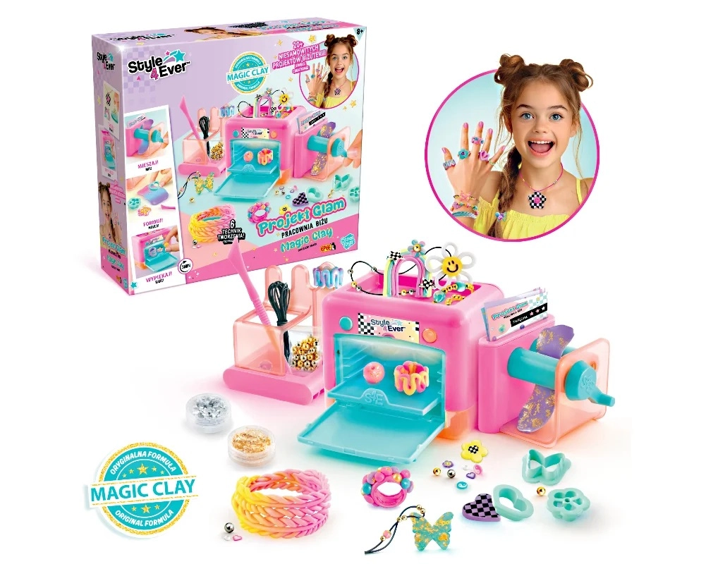 Zestaw Glam – Pracownia Biżu jest idealny dla małych twórczyń od 6 lat, które kochają modę i chętnie próbują nowych technik. Specjalna masa modelarska łatwo się kształtuje i szybko twardnieje, dzięki czemu pomysł szybko zmienia się w gotową biżuterię. Dzięki dołączonemu urządzeniu do utwardzania prace będą trwałe i gotowe do noszenia lub podarowania.