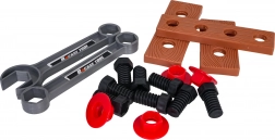 W opakowaniu znajdziesz wszystko, co potrzebne: młotek, szczypce, klucz do rur, klucz nastawny, śrubokręt z wymiennymi bitami, śruby, nakrętki oraz „drewniane” listwy z otworami do ćwiczeń. Elementy zaprojektowano z myślą o małych dziecięcych dłoniach, z naciskiem na wygodny chwyt i bezpieczne użytkowanie.
